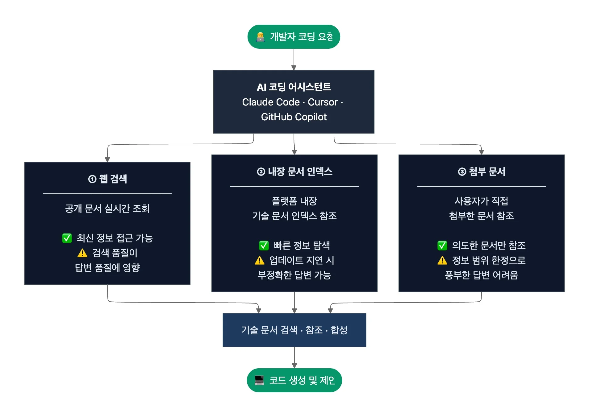 AI 코딩 어시스턴트가 문서를 소비하는 경로는 크게 세 가지인데요. 첫째, 웹 검색으로 공개 문서를 실시간 조회하고요. 둘째, 플랫폼에 내장된 기술 문서 인덱스를 참조합니다. 셋째, 사용자가 직접 첨부한 문서를 읽기도 하죠.