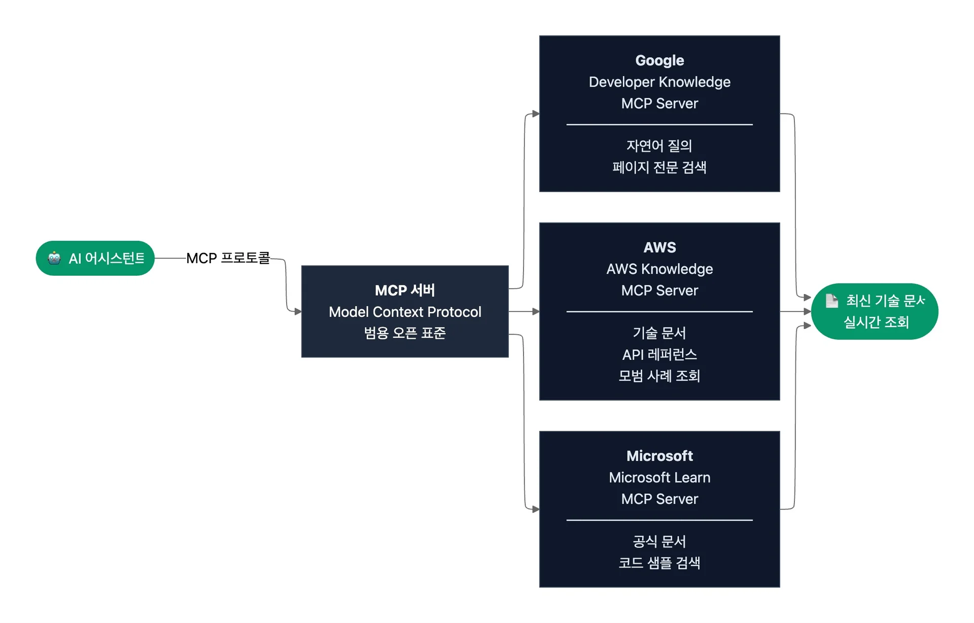 이미 주요 클라우드 벤더가 자사 기술 문서에 접근할 수 있는 MCP 서버를 출시했는데요. Google은 자연어 질의와 페이지 전문 검색이 가능한 Developer Knowledge MCP Server를, AWS는 자사 기술 문서와 API 레퍼런스, 모범 사례를 조회할 수 있는 AWS Knowledge MCP Server를, Microsoft는 Microsoft Learn의 공식 문서와 코드 샘플을 검색·조회할 수 있는 Microsoft Learn MCP Server를 제공합니다. 3대 클라우드 벤더가 이 방식을 채택한 것은 AI의 실시간 문서 접근을 전략적으로 중요한 경로로 판단하고 있다는 신호입니다.