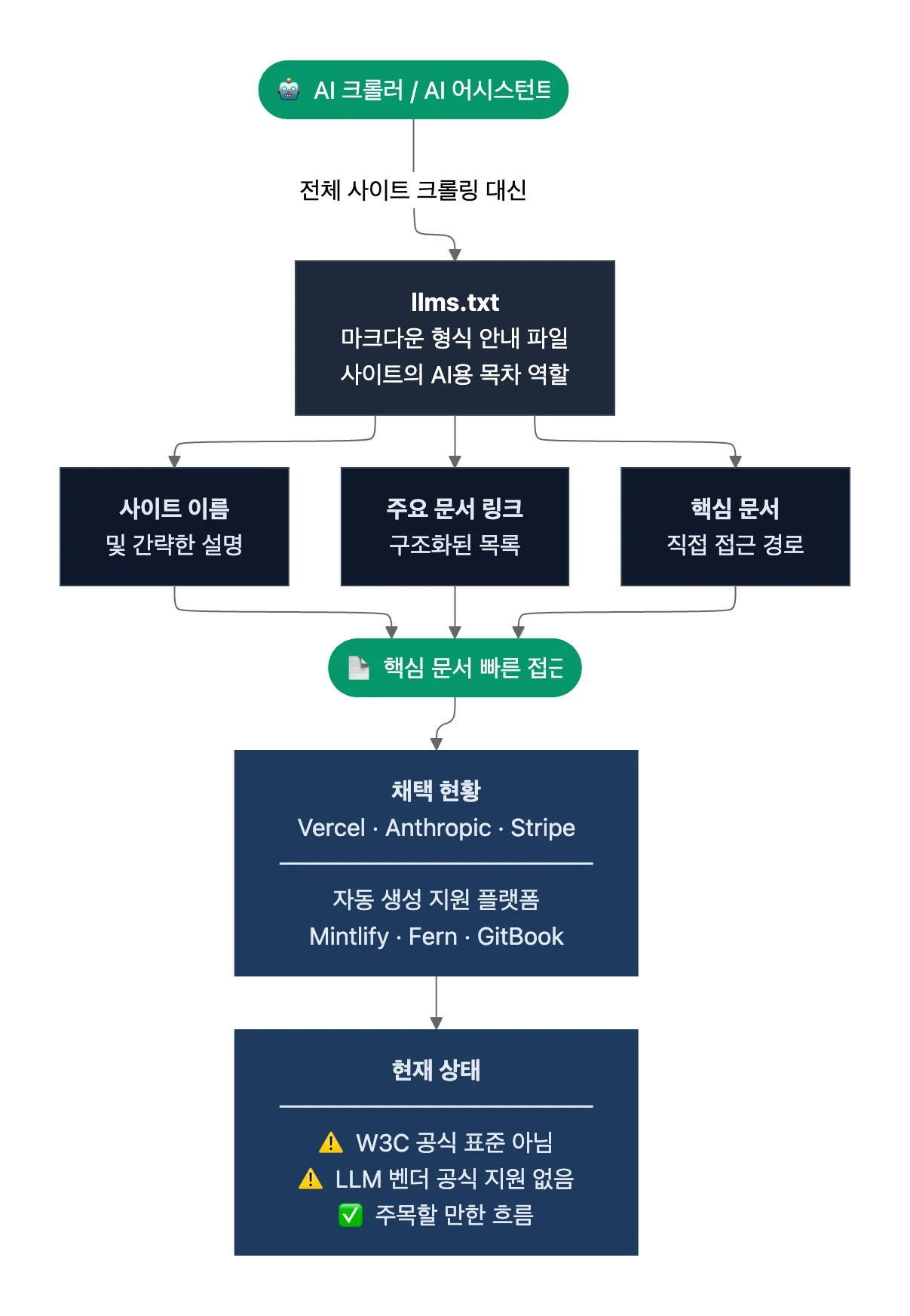 2024년 9월 AI 연구·개발 랩 Answer.AI 공동 창립자인 Jeremy Howard가 llms.txt를 제안했고요. 이후 Vercel, Anthropic, Stripe 등이 이를 채택한 것으로 알려졌습니다. Mintlify, Fern, GitBook 등 주요 문서 플랫폼이 llms.txt의 자동 생성을 지원하죠.