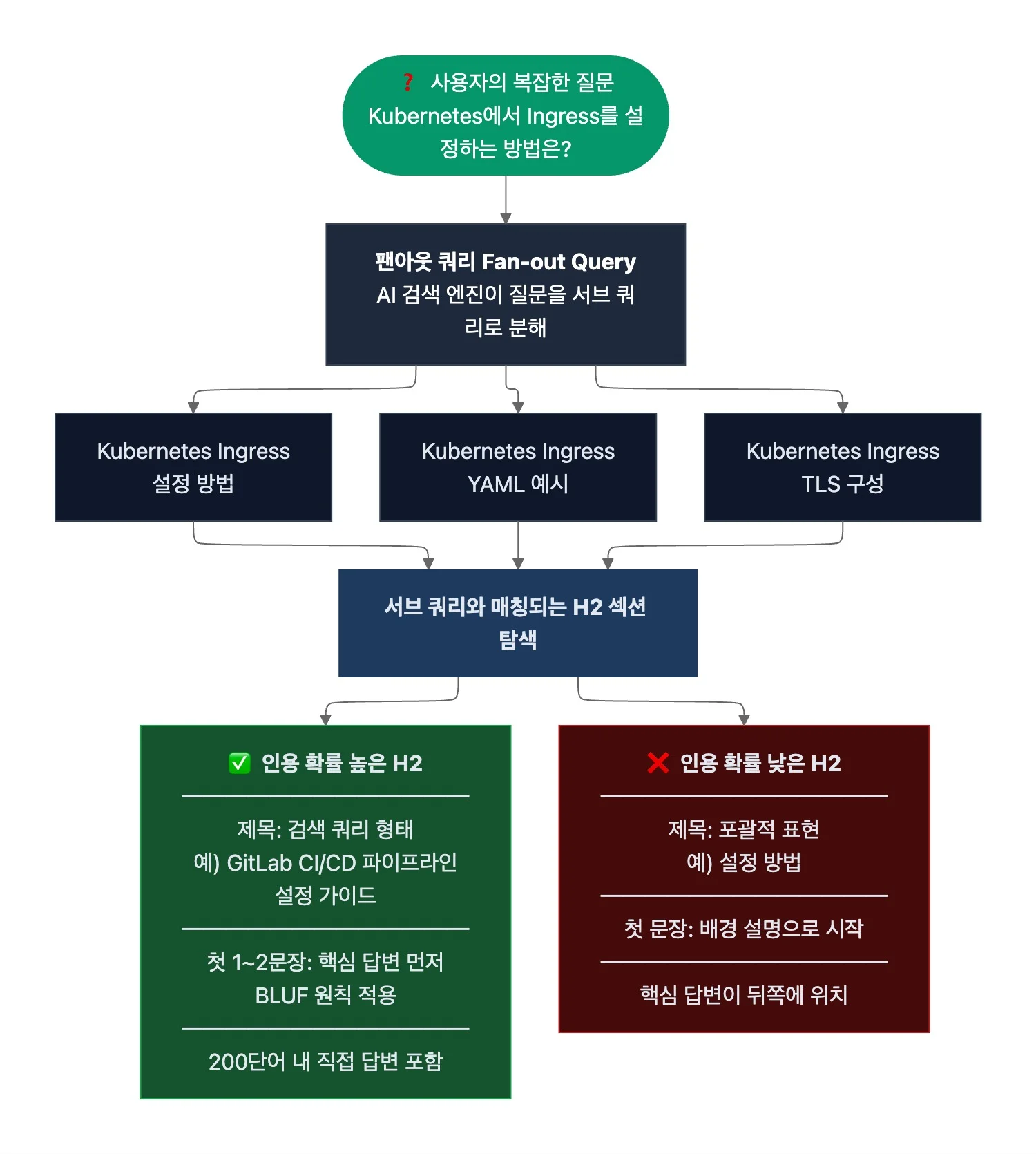 - AI 검색 엔진은 사용자의 복잡한 질문을 여러 개의 서브 쿼리로 분해해 각각 별도로 검색하는 ‘팬아웃 쿼리’ 방식으로 동작합니다. 예를 들어, “Kubernetes에서 Ingress를 설정하는 방법은?”이라는 질문은 “Kubernetes Ingress 설정 방법”, “Kubernetes Ingress YAML 예시”, “Kubernetes Ingress TLS 구성” 등으로 분해되죠. 문서의 각 H2 섹션이 이러한 서브 쿼리 하나의 답이 될 수 있어야 AI 검색 결과에 해당 섹션이 인용될 확률이 높아집니다.
