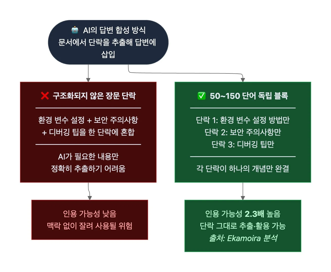 - 앞서 H2 섹션 단위의 독립성을 다뤘다면, 여기서는 섹션 안의 각 단락 단위의 독립성을 다룹니다. AI는 답변을 합성할 때 문서에서 특정 단락을 추출해 답변에 삽입합니다. AI 검색 가시성 분석 플랫폼 Ekamoira의 분석에 따르면, 50 ~ 150 단어 단위의 자기 완결적 블록으로 구성된 콘텐츠는 구조화되지 않은 장문 콘텐츠보다 AI에 2.3배 더 많이 인용됐죠.