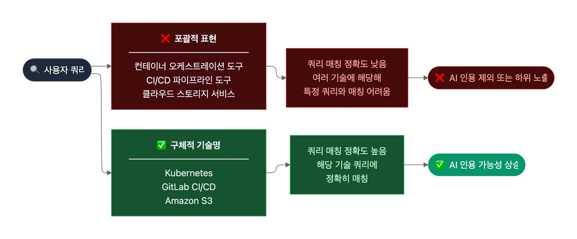 - 기술 문서에서 포괄적인 표현 대신 구체적인 기술명을 사용합니다. 예를 들어, "컨테이너 오케스트레이션 도구”보다 "Kubernetes", "CI/CD 파이프라인 도구"보다 "GitLab CI/CD"처럼 구체적인 이름을 쓰면 AI가 해당 기술 관련 쿼리에 더 정확히 매칭할 수 있습니다.