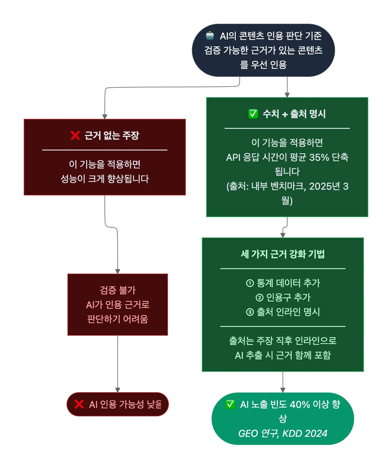 - 주장에는 출처를, 성과에는 구체적 수치를 포함합니다. 예를 들어, 기술 문서에서 "이 기능을 적용하면 성능이 크게 향상됩니다"보다 "이 기능을 적용하면 API 응답 시간이 평균 35% 단축됩니다(출처: 내부 벤치마크, 2025년 3월)"처럼 수치와 출처를 함께 명시하면 AI가 인용할 가능성이 높아집니다. 출처는 주장 직후에 인라인으로 달아 AI가 해당 문장을 추출할 때 근거가 함께 포함되도록 합니다.