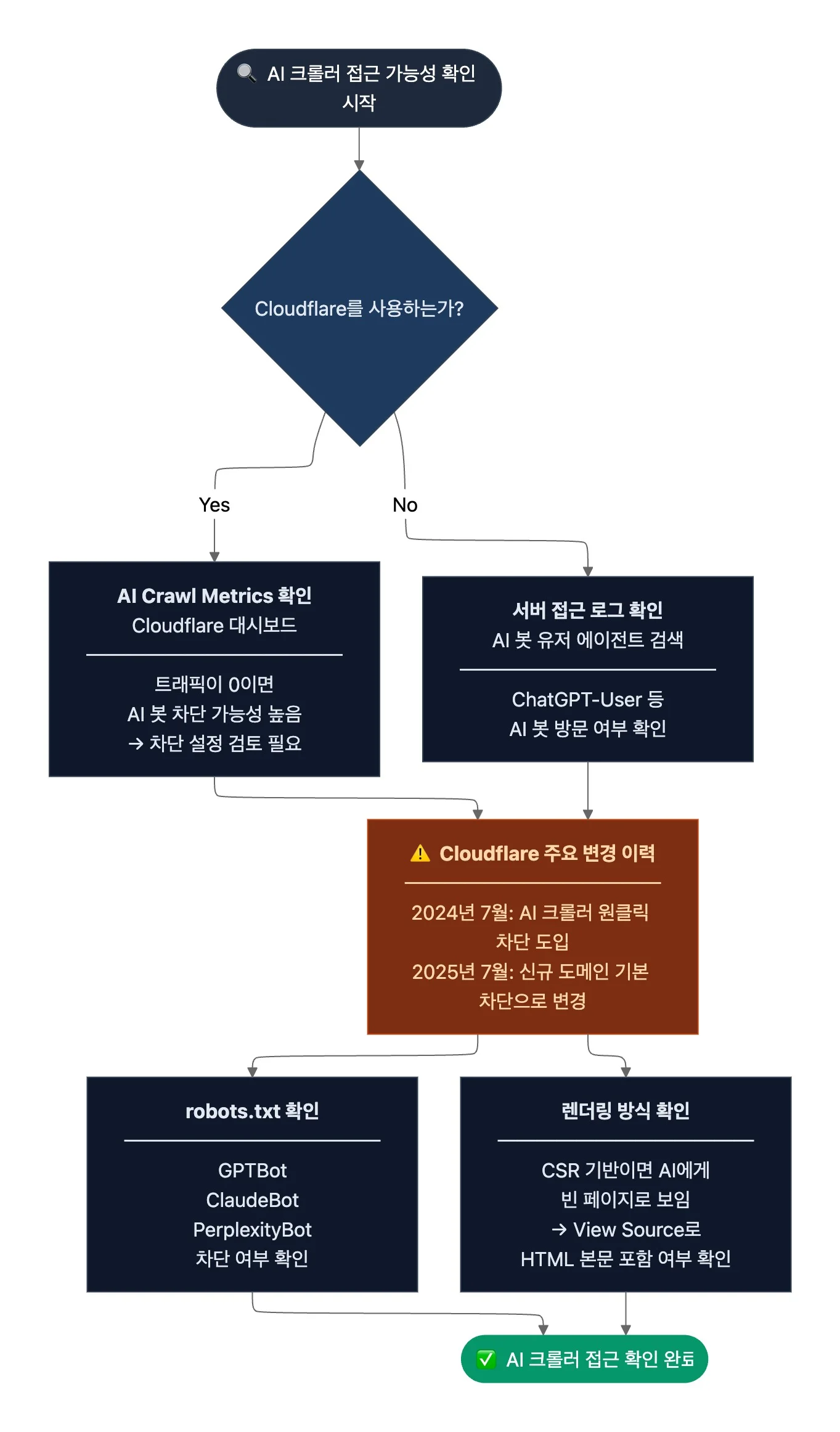 - Cloudflare는 2024년 7월에 ‘AI 크롤러 원클릭 차단’ 옵션을 도입했습니다. 이어 2025년 7월부터 신규 도메인에 AI 크롤러 차단을 기본 설정으로 변경했는데요. Cloudflare를 사용하는 사이트는 별도 설정 변경 없이는 AI 봇 트래픽이 자동으로 차단됐을 수 있죠. 이 상태에서는 기술 문서 구조를 개선해도 AI가 문서를 읽을 수 없는데요. AI 크롤러의 문서 사이트 접근 가능성은 반드시 먼저 확인해야 합니다.