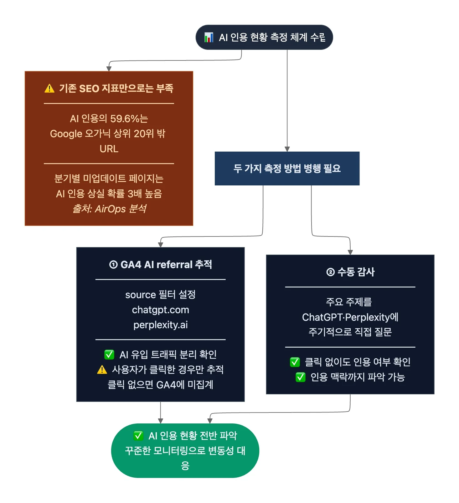 - AI 크롤러 접근 가능성 확인과 AI 인용 현황 측정 체계 구축이 필요합니다.