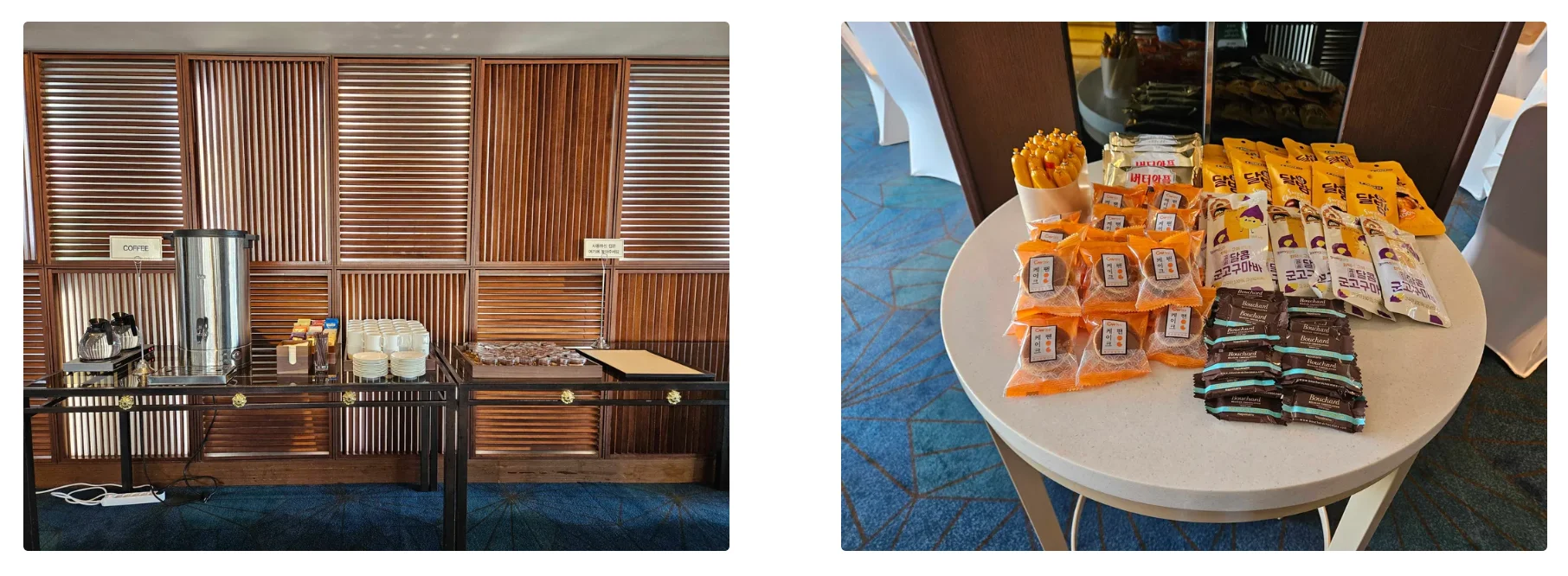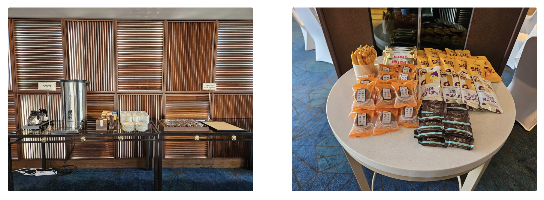 행사장 왼편에는 따뜻한 커피와 차, 달콤한 다과를 풍성하게 준비했습니다.