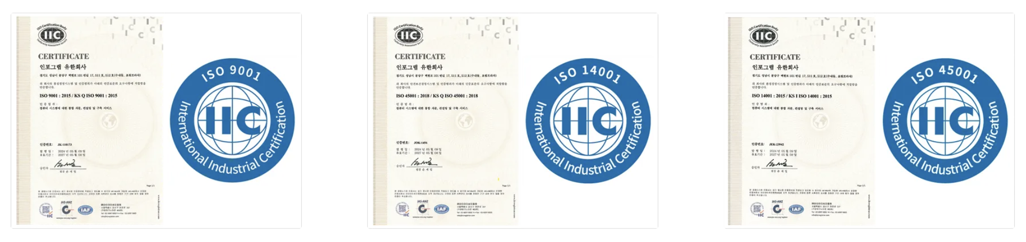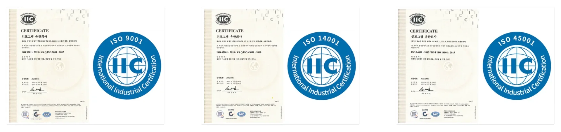 특히 ISO 9001(품질 경영 시스템), 14001(환경 경영 시스템), 45001(안전보건 경영 시스템)까지 총 3개 인증을 획득해 ‘국제표준규격에 부합하는 경영 시스템을 갖춰 운영하고 있음’을 대내외에 인증했습니다.
