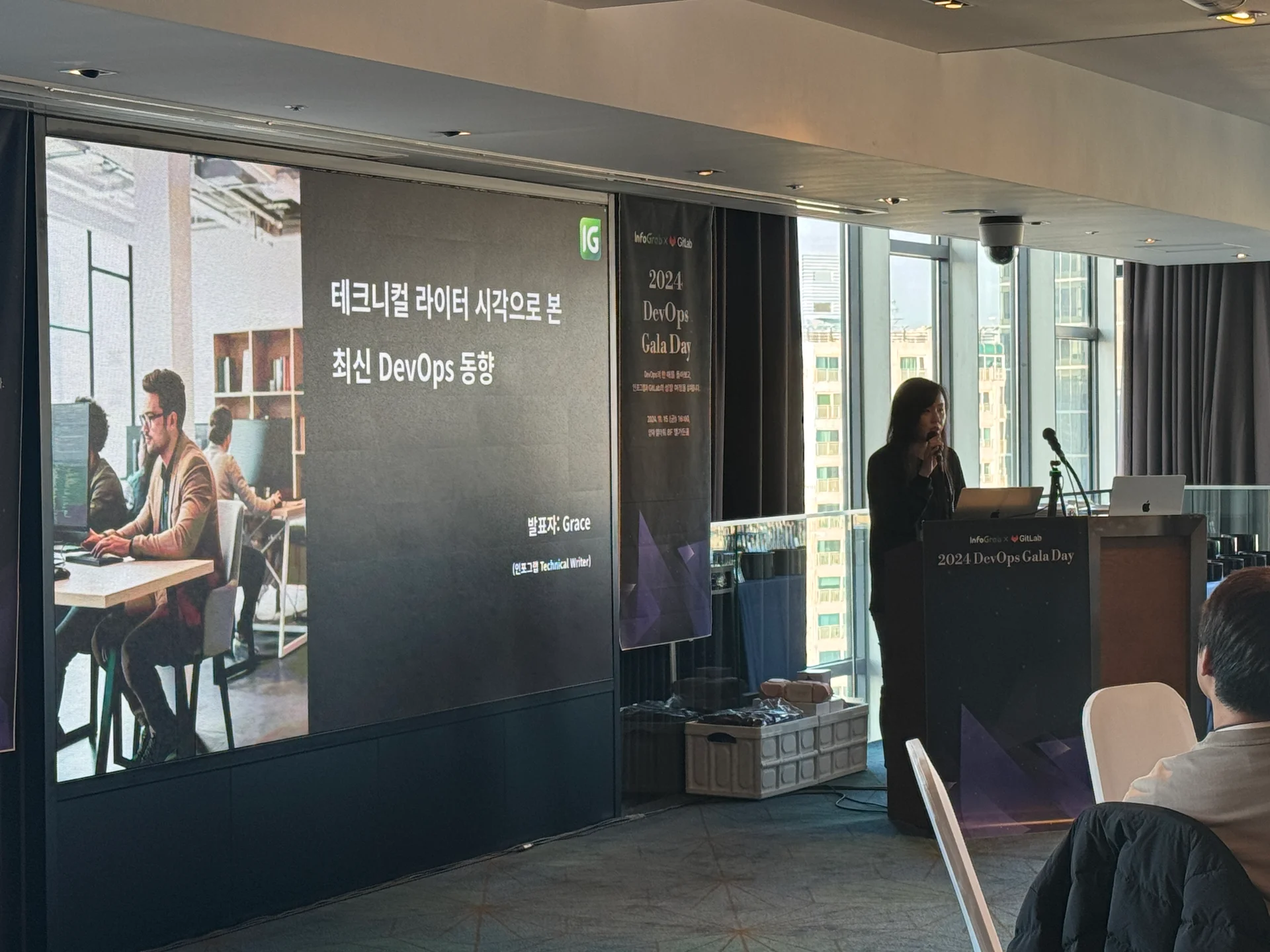 그다음, 첫번째 세션이 진행됐는데요. 인포그랩 테크니컬 라이터 Grace가 ‘테크니컬 라이터 시각으로 본 최신 DevOps 동향’을 주제로 2024년 DevOps 도입 현황과 요즘 부각되는 DevOps 동향, DevOps 필수 기술 시장 전망과 도전 과제를 발표했습니다.
