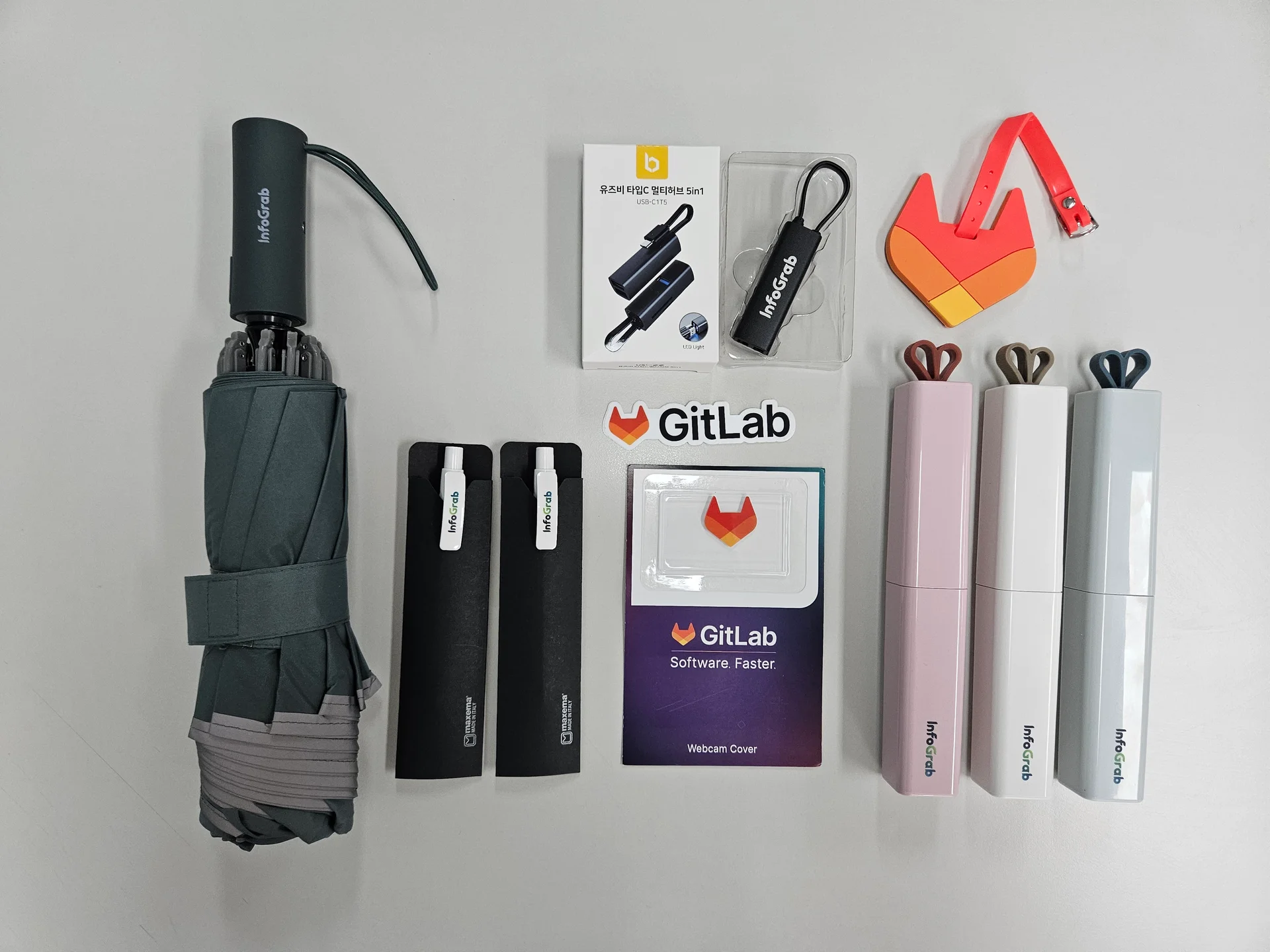 행사에 참석한 모든 분께는 우산, 칫솔세트, 멀티허브, 볼펜(이상 인포그랩 스페셜 굿즈), 웹캠 커버, 가방 고리, 스티커(이상 GitLab 스페셜 굿즈)로 스웩 가방을 알차게 꾸려 전달해 드렸어요.