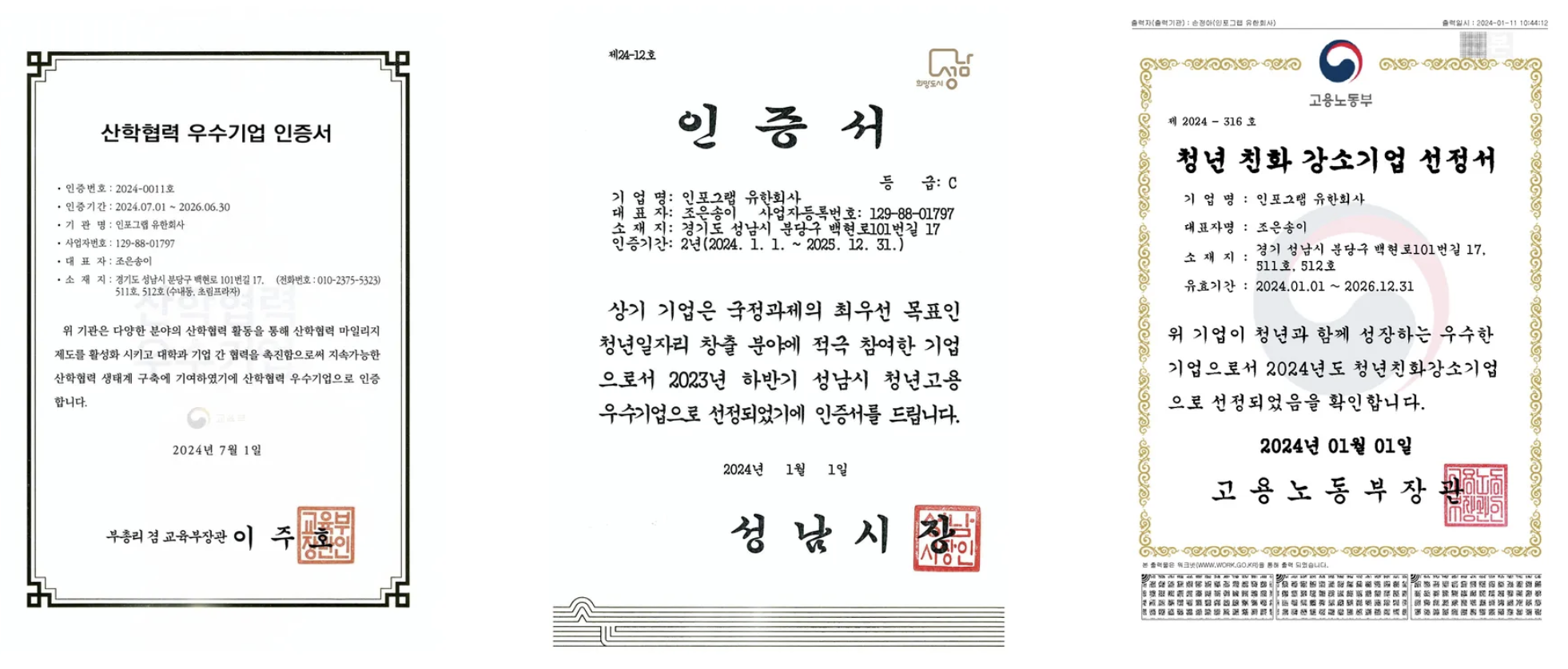 산학협력 우수기업, 성남시 청년 고용우수기업, 청년친화 강소기업에 잇따라 선정돼 ‘청년들이 쾌적한 업무 환경에서 안정적으로 일하고, 커리어를 발전시키기에 좋은 기업’으로 공공기관 인증을 받았죠!