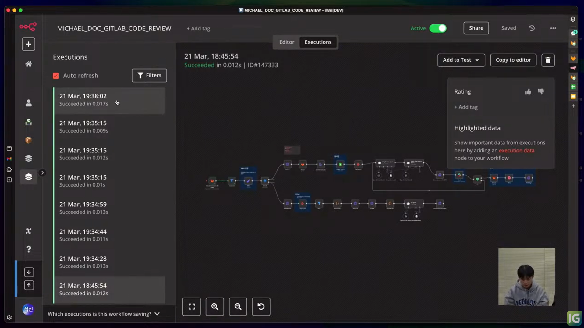 세 번째 세션에서는 Michael이 n8n과 GitLab으로 AI 기반 코드 리뷰를 자동화하는 두 가지 방식을 소개했어요. 하나는 전체 코드 리뷰, 다른 하나는 코드 제안 중심의 리뷰인데요. 각 기술의 실무 적용 방법을 구체적인 예시와 함께 설명해 줬습니다.