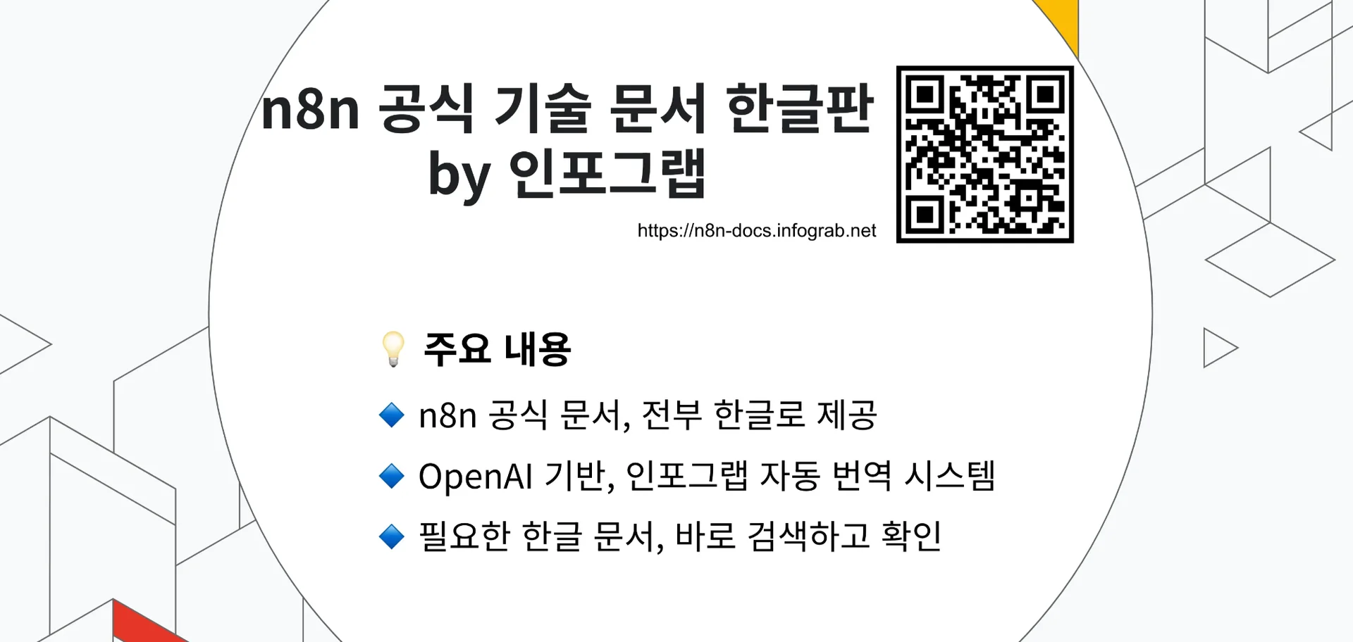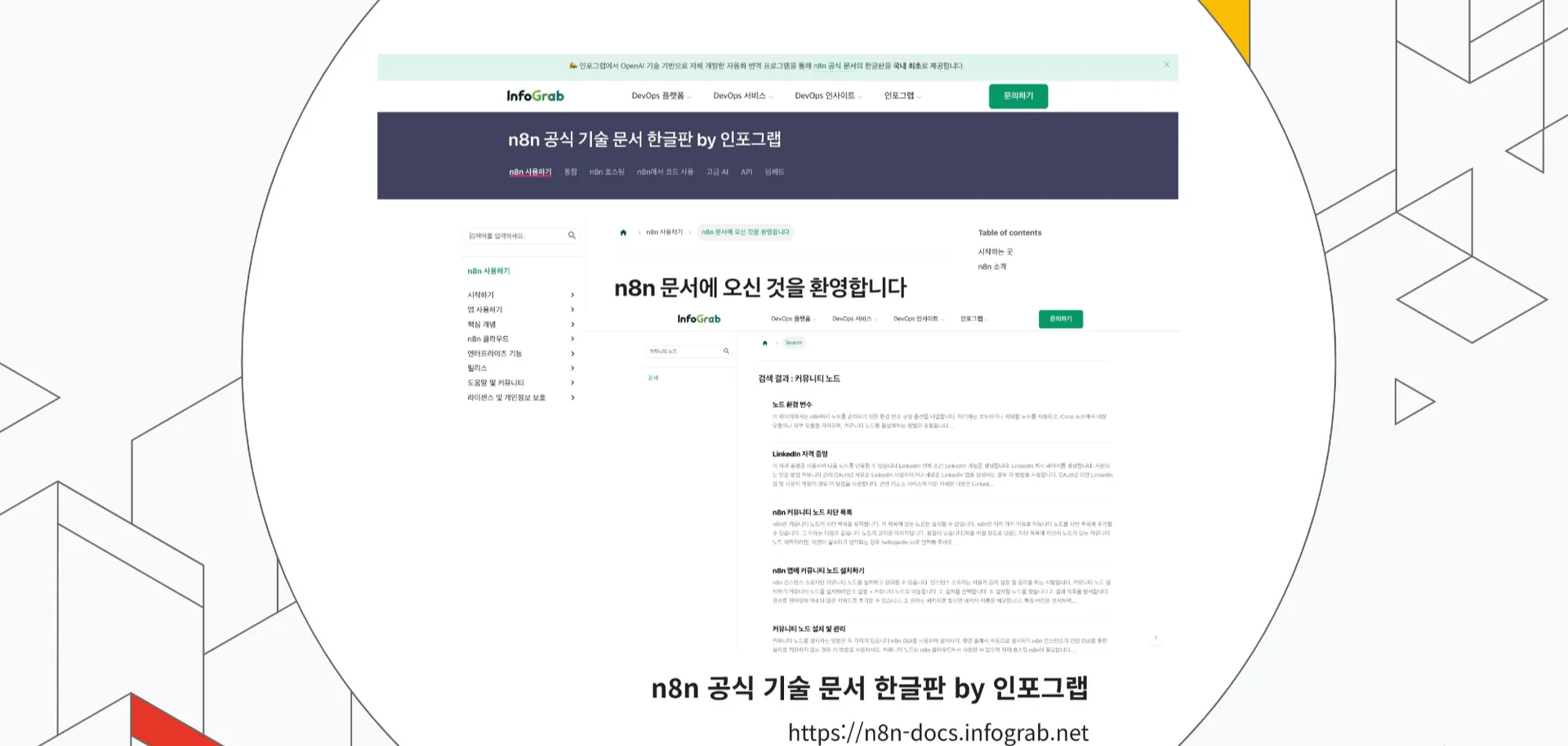 n8n 공식 기술 문서 한글판에서는 인포그랩의 GPT 기반 자동 번역 프로그램을 활용해 n8n 전체 공식 문서를 한글로 제공합니다.