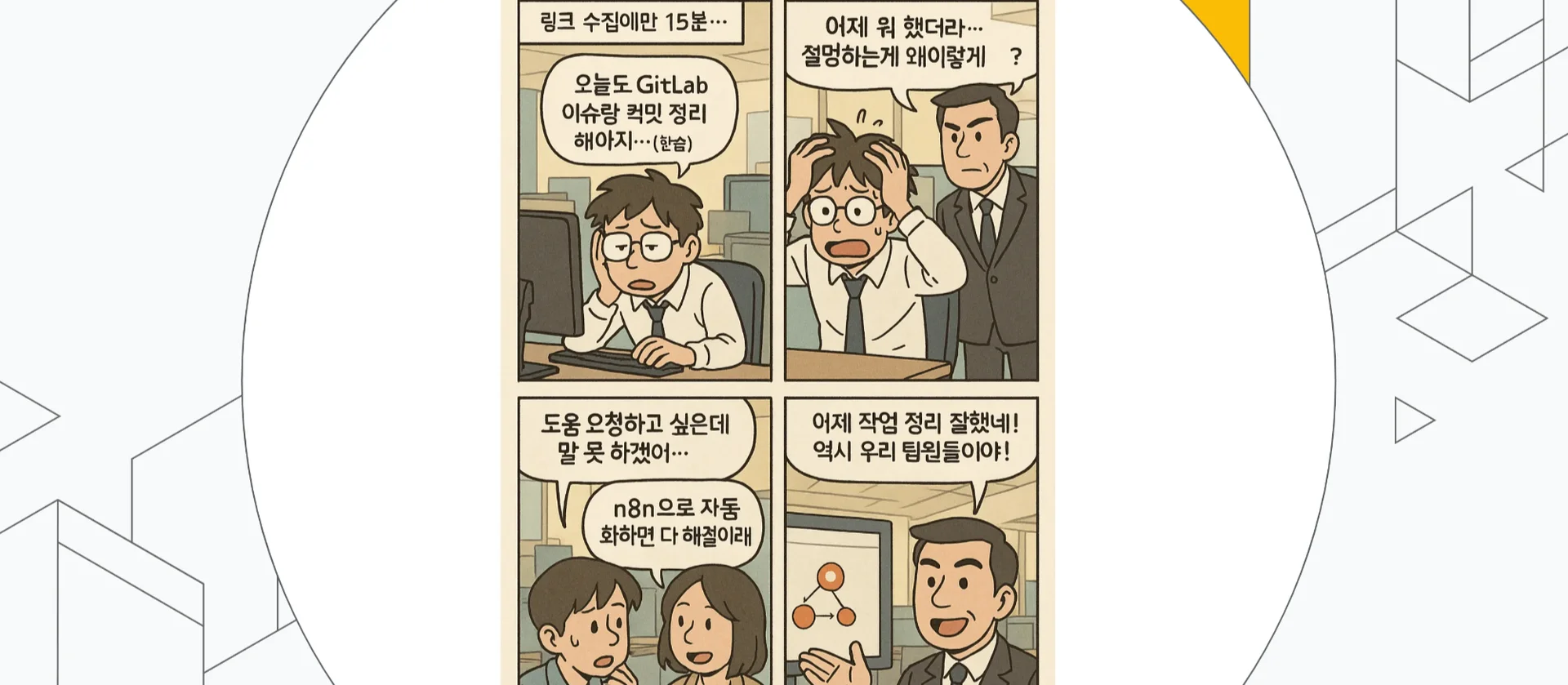 ‘보고’는 필수 업무지만, 반복되다 보면 시간이 오래 걸려 부담스러울 때도 있는데요. n8n으로 이를 자동화하면 소통 업무 간소화, 보고 누락 방지, 업무 투명성 향상, 조직 신뢰도 강화 효과를 거둘 수 있습니다. Fabbro가 발표한 ‘개발팀 스탠드업 자동화’는 이 효과를 달성하는 지름길로, 팀 협업의 품질까지 높이는 뜻깊은 사례였습니다.