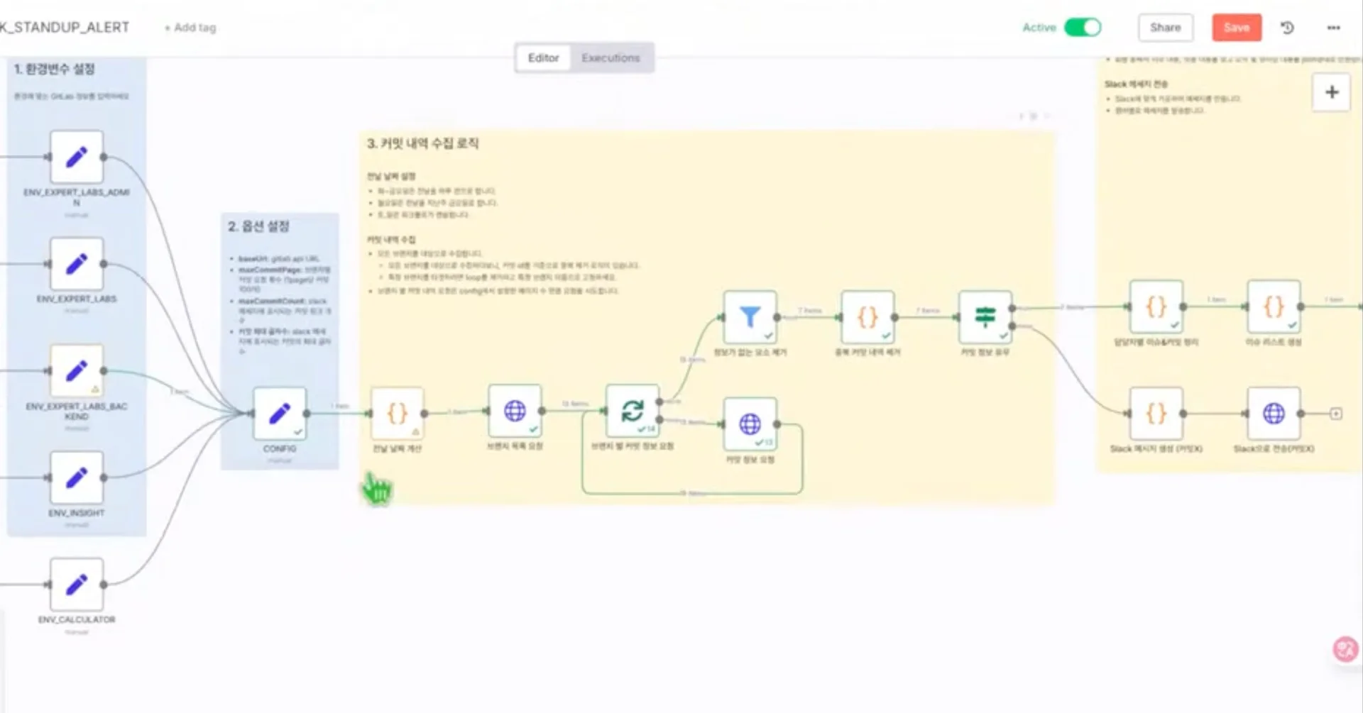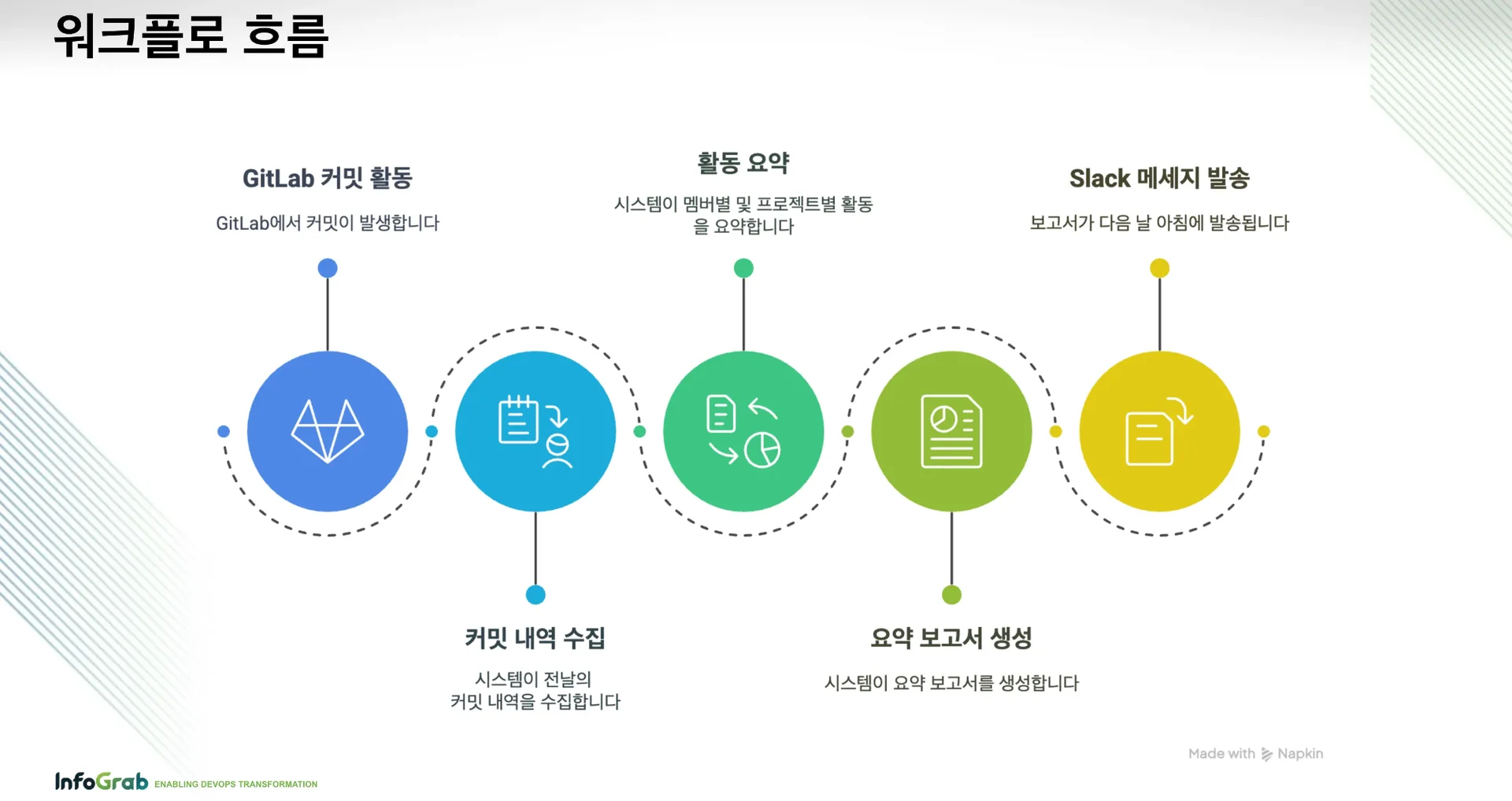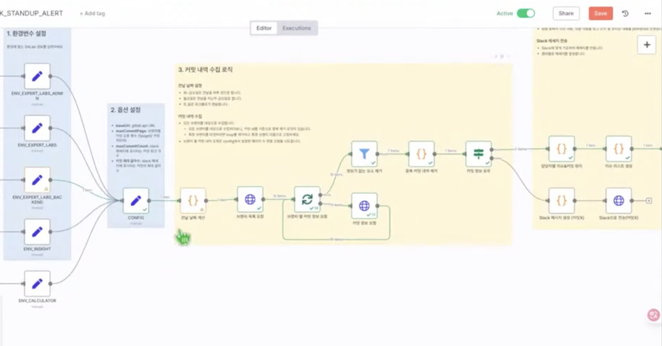 구체적인 워크플로는 이렇습니다. GitLab에서 전날 커밋 내역 수집 → 팀원별/프로젝트별 활동 요약 → 요약 보고서 생성 → 다음 날 아침, Slack에 보고서를 발송하는 방식이고요.