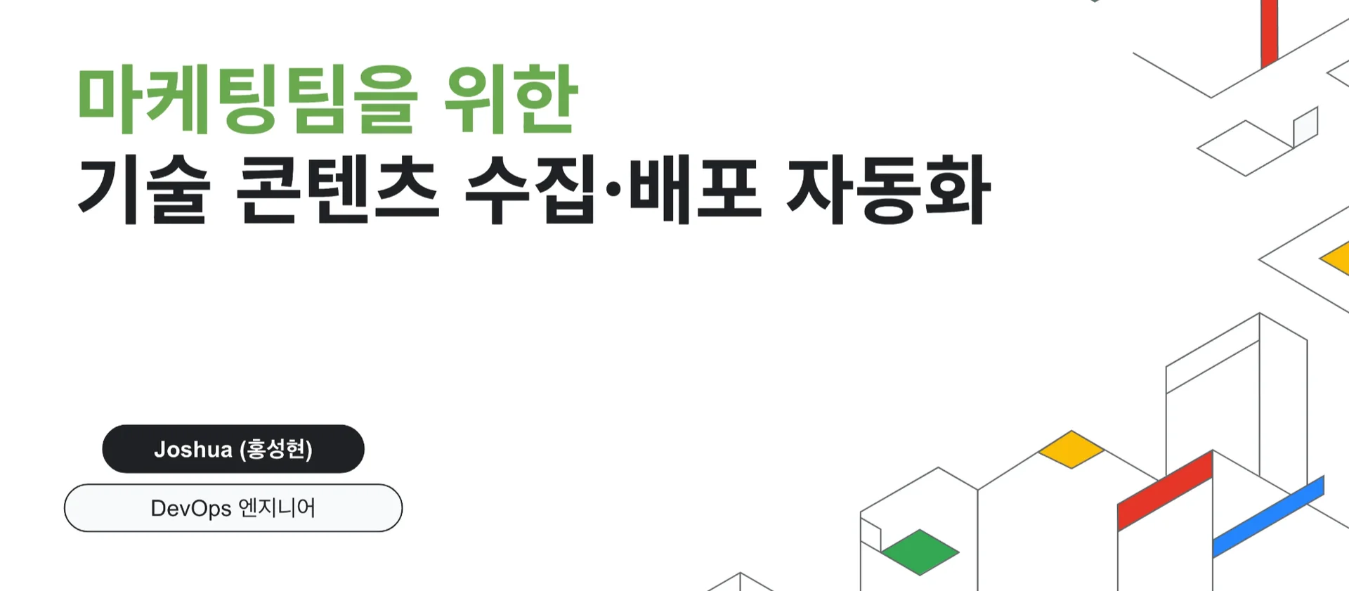 세 번째 세션에서는 DevOps 엔지니어 Joshua가 ‘마케팅팀을 위한 기술 콘텐츠 수집·배포 자동화’를 주제로 발표했습니다.