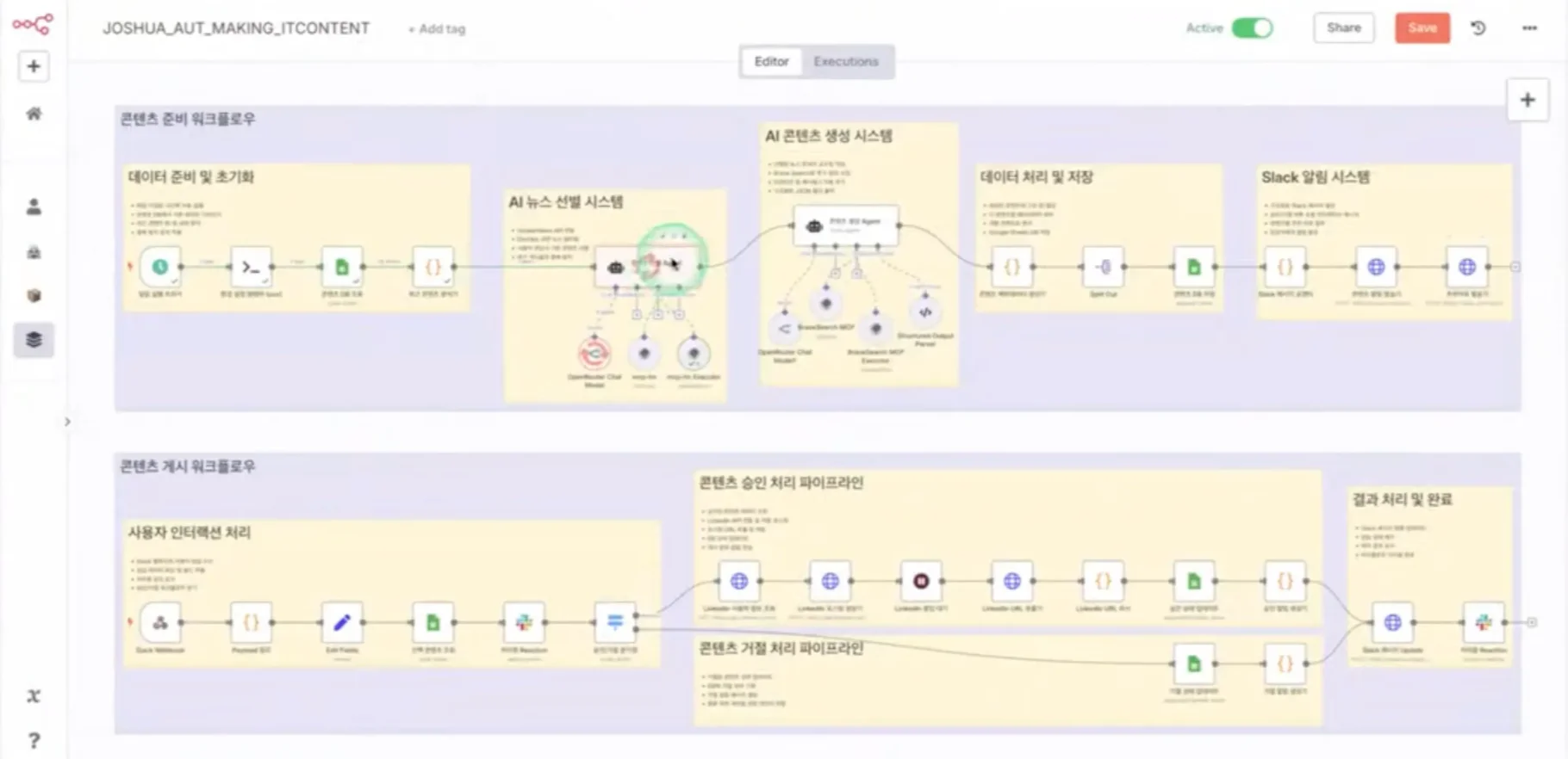 기술 콘텐츠 수집·배포 자동화 워크플로의 핵심은 바로 AI 에이전트였는데요. Joshua는 두 가지 AI 에이전트를 만들었습니다. 하나는 콘텐츠 선별 에이전트, 다른 하나는 콘텐츠 생성 에이전트인데요. 이는 무분별한 콘텐츠 생성을 제어하고, 콘텐츠 품질을 개선하기 위한 장치로 개발했습니다.