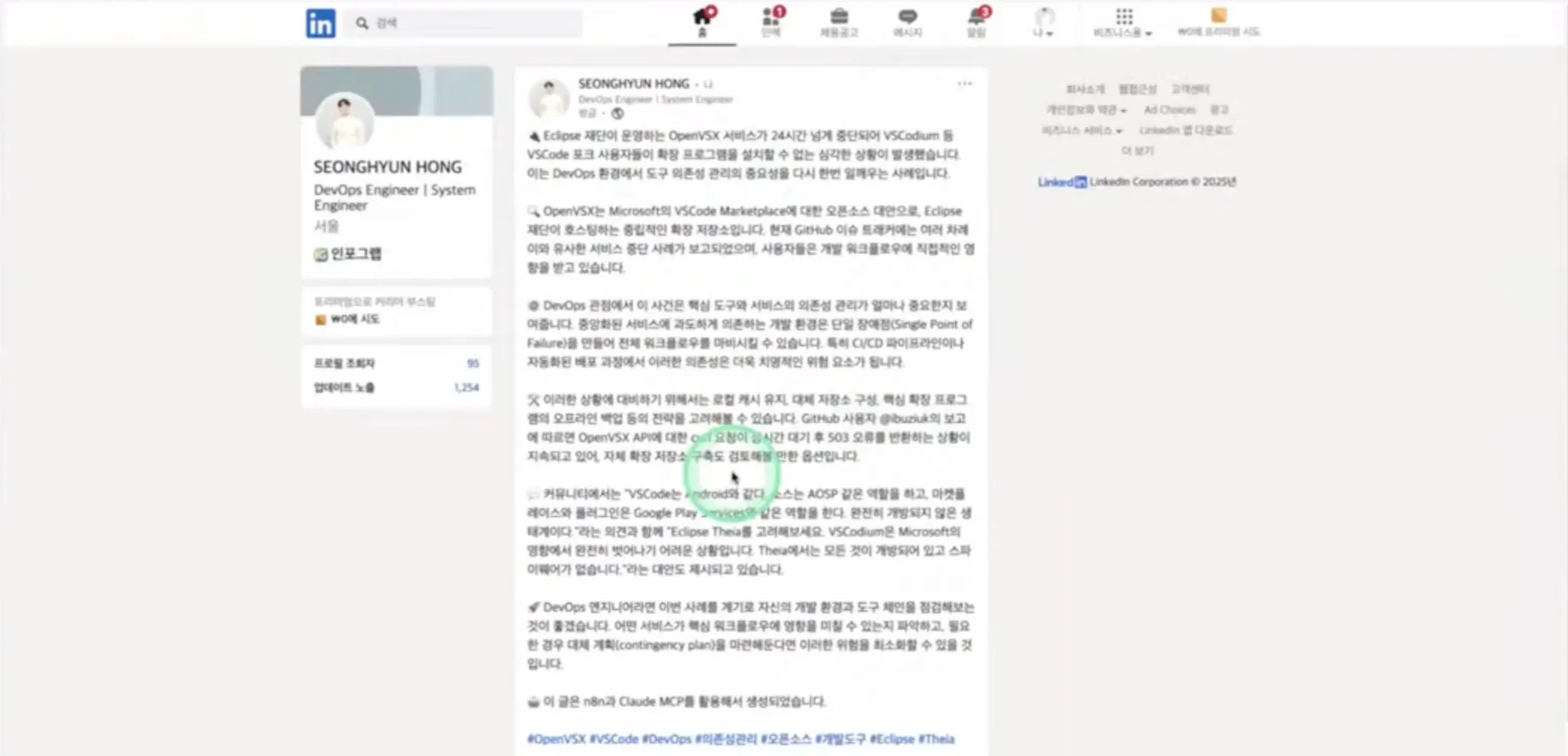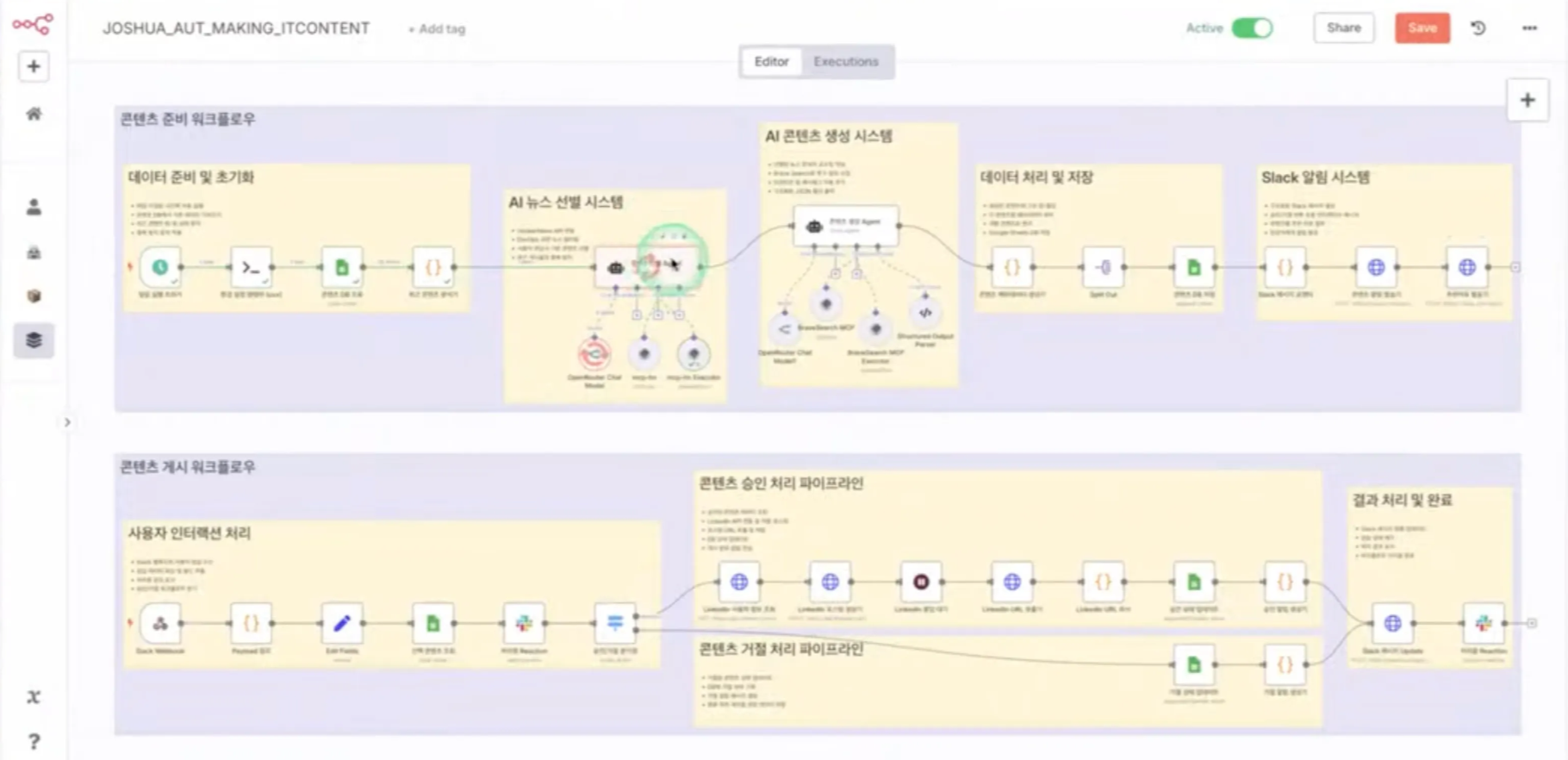 DevOps/시스템 엔지니어 대상 콘텐츠를 Hacker News에서 자동 수집하고, 링크드인에 자동 배포하는 워크플로를 공개했는데요. 특히 정교한 프롬프트 엔지니어링으로 고품질 콘텐츠를 자동 선별한 뒤, 정보를 체계적으로 구조화해 가독성 높게 자동 편집한 점이 돋보였습니다. 이 워크플로도 MCP와 n8n을 연동한 사례였어요.