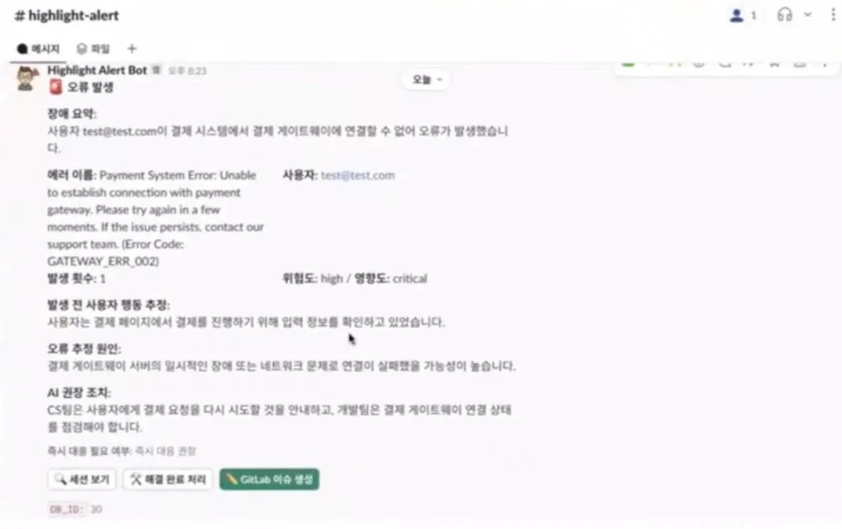 Slack에 보낸 오류 메시지는 장애 요약, 에러 이름, 사용자, 발생 횟수, 위험도/영향도, 발생 전 사용자 행동 추정, 오류 추정 원인, AI 권장 조치로 상세하게 구성했습니다.