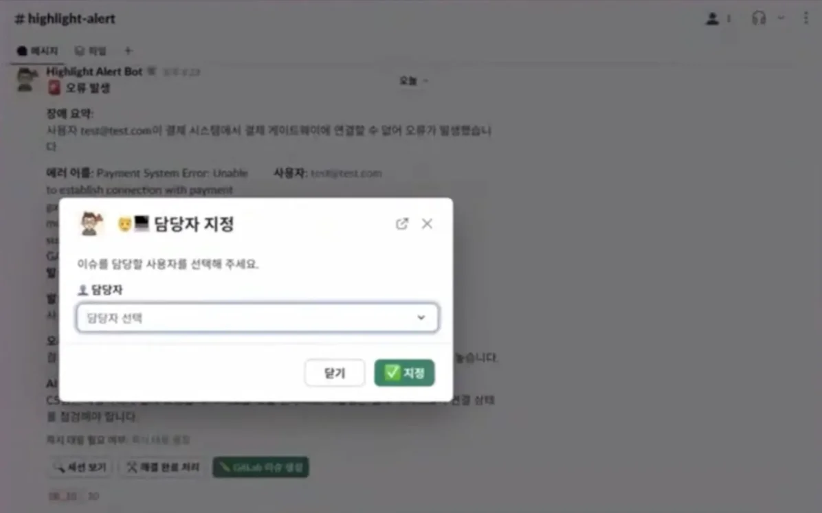 아울러 오류 메시지 하단에는 ‘세션 보기’, ‘해결 완료 처리’, ‘GitLab 이슈 생성’ 버튼이 포함됐는데요. ‘세션 보기’ 버튼을 누르면 Hightlight에 들어가 대시보드를 보고 오류 상황을 면밀히 파악할 수 있고요. 또 ‘GitLab 이슈 생성’ 버튼을 클릭하면 Slack에서 GitLab 이슈를 생성하고, 담당자를 할당할 수 있죠. Slack 오류 메시지에 담긴 내용은 GitLab 이슈에 자동 등록됩니다.