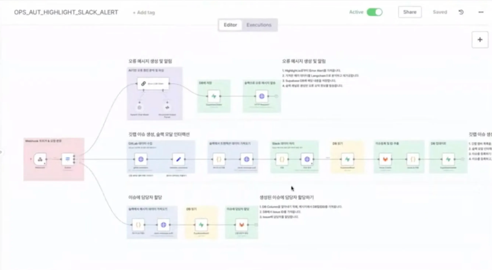 B2C 환경에서 발생하는 고객 이슈를 AI로 자동 분석하고, Slack과 GitLab으로 신속하게 대응하는 CS 자동화 워크플로를 소개했는데요. 기존 장애 대응 과정에서 반복되던 수작업을 n8n으로 대폭 간소화해 주목받았습니다.