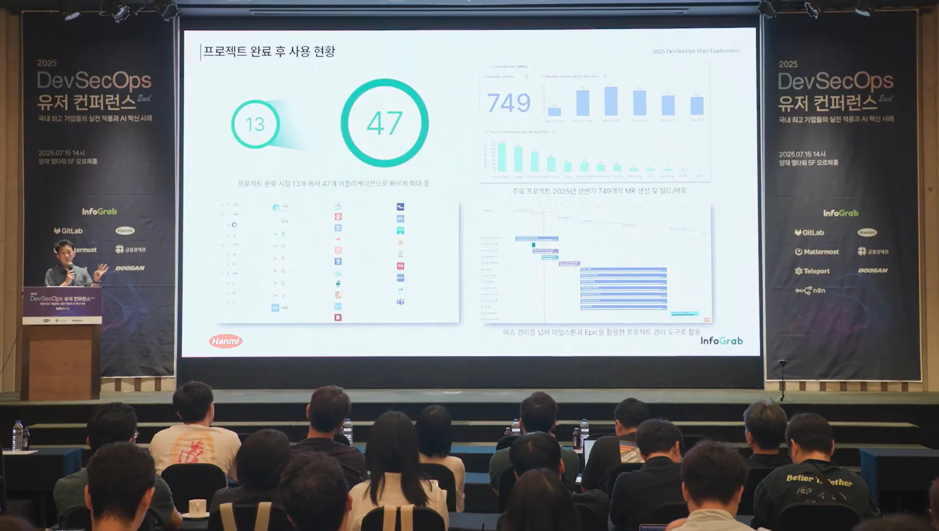 GitLab을 기반으로 레거시 시스템을 연동하고, 자동화와 품질 개선까지 이뤄낸 과정을 구체적으로 소개해주셨습니다. 실제로 한미사이언스에서 구현한 DevOps 아키텍처까지 공개해주셔서, 현장에 계신 분들 모두 많은 인사이트를 얻으셨을 것 같습니다.