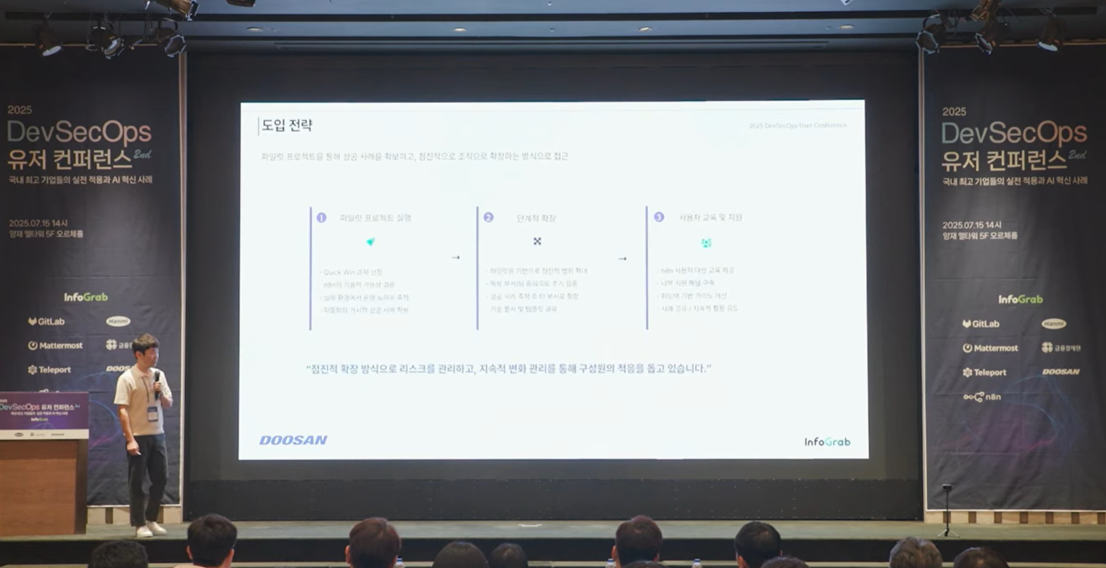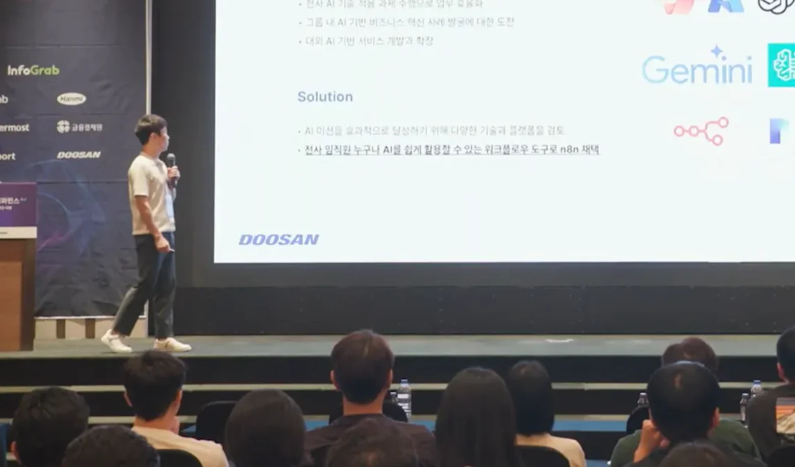 세 번째 세션은 두산디지털이노베이션의 양한주 수석님께서 워크플로우 자동화 도구인 n8n의 도입 배경부터 실제 사내에 적용한 과정까지 솔직하게 들려주셨는데요.