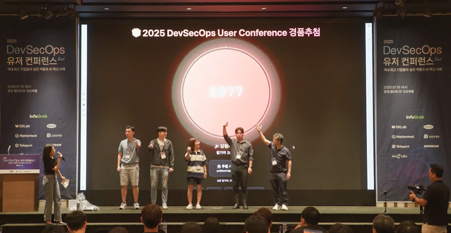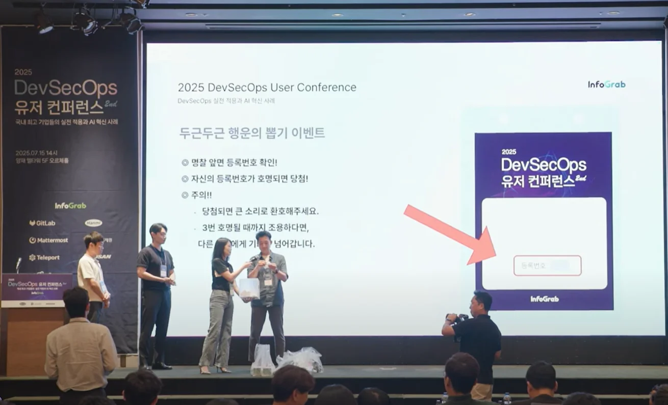 발표자 분들께서 직접 추첨을 진행해 인포그랩과 GitLab, Mattermost, Teleport, n8n의 다양한 스웩을 선물로 나눠드렸는데요.