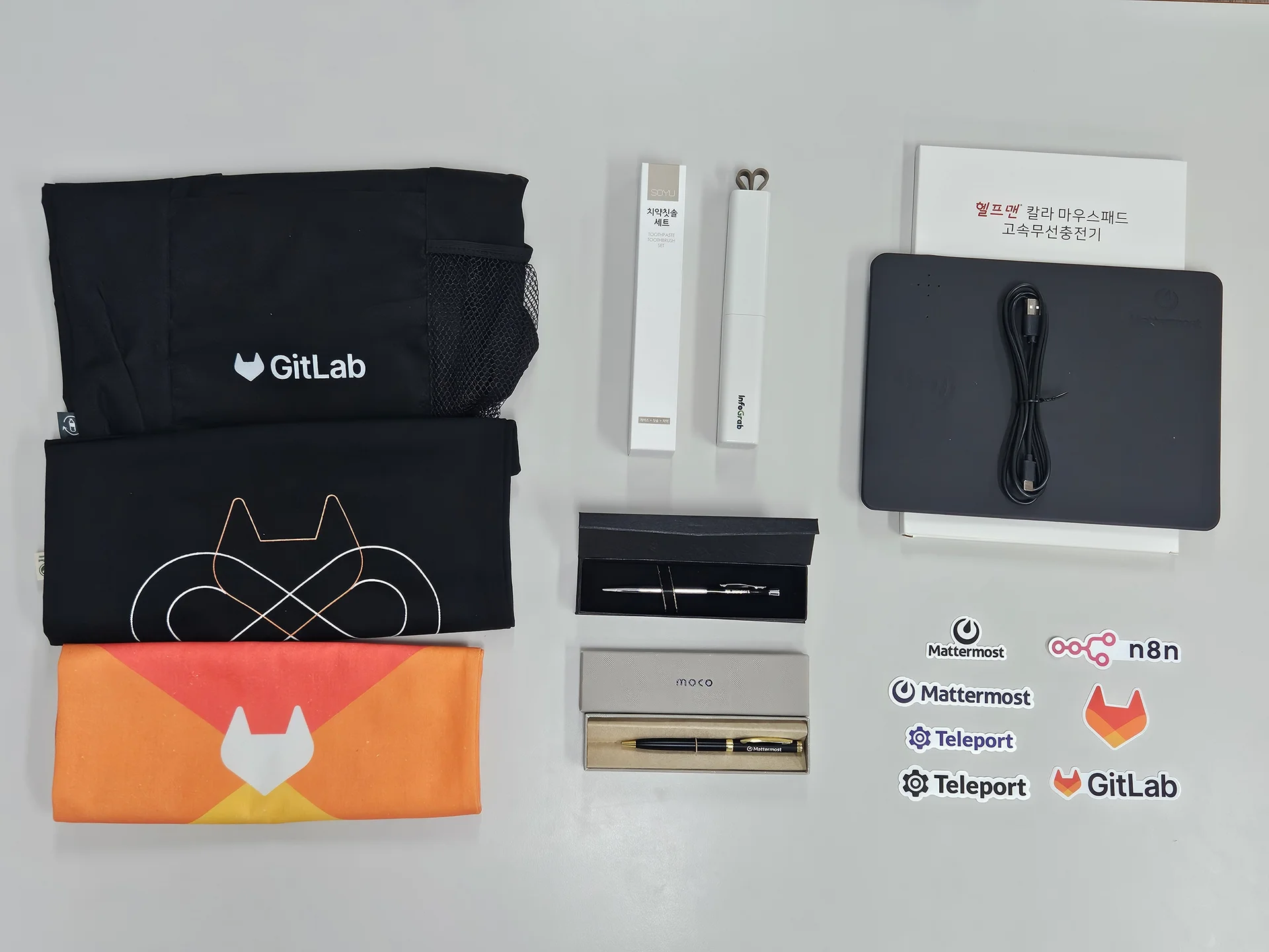 두근두근 했던 이벤트까지 마친 후, 두 손 가득 즐거움을 가지고 가실 수 있도록 세션에 대한 설문조사에 참여해주신 분들께 인포그랩과 GitLab, Mattermost, Teleport, n8n 스웩이 담긴 기프트 팩을 증정해드렸습니다.