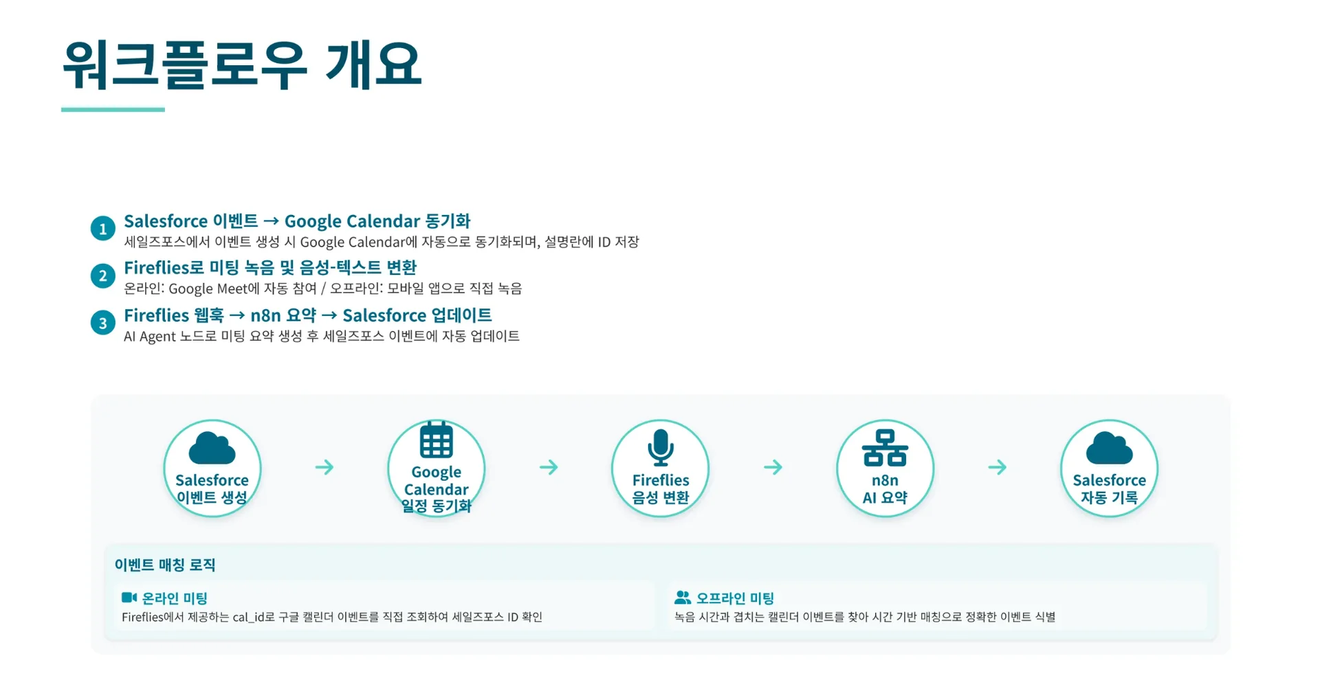 세일즈 미팅 로그 자동화의 핵심은 ‘세일즈 미팅을 녹음만 하면 Salesforce에 요약된 로그가 자동으로 기록되는 것’이었습니다. 구체적인 워크플로는 다음과 같은데요. Salesforce에 미팅 이벤트 생성 → Google Calendar 동기화 → Fireflies로 미팅 녹음·전사 → n8n의 AI Agent 노드로 요약 생성 → Salesforce 이벤트에 자동 업데이트되는 흐름입니다. 미팅 로그는 기본 정보, 요약, 다음 단계, 고객 맥락, 고객 평가 프레임워크 기반 분석으로 구성되고, 온·오프라인 미팅을 모두 지원하도록 구축했고요.