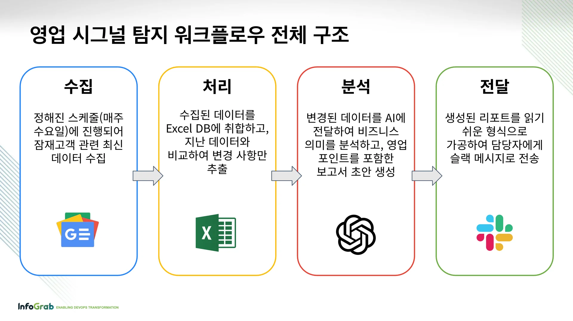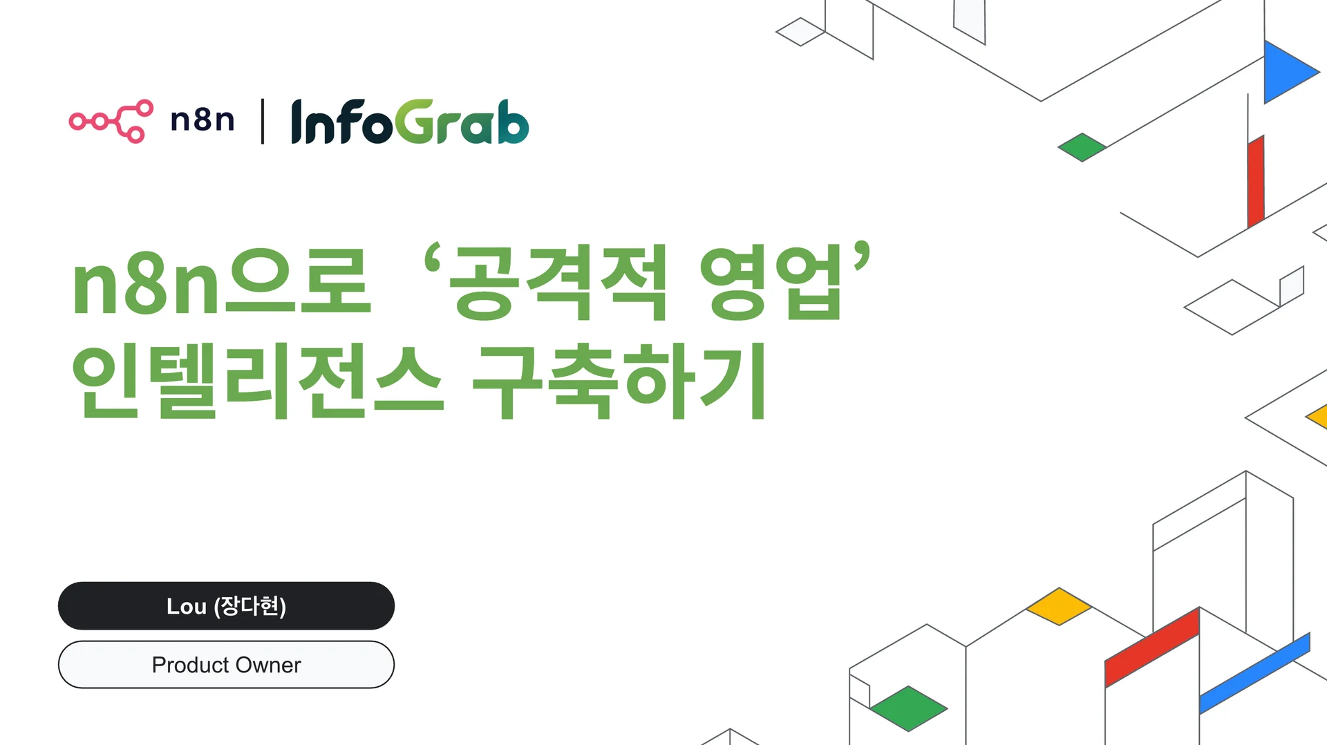 두 번째 세션에서는 인포그랩의 DevOps 프로덕트 오너 Lou가 ‘고객사/경쟁사 영업 시그널 수집 자동화’를 주제로 발표했습니다. 고객사 채용, 투자 유치, 경쟁사 동향 등 영업 핵심 시그널을 자동 수집하는 워크플로를 공개했는데요. n8n으로 딜 타이밍을 선점하고 시장 변화에 즉각 대응하는 인사이트를 얻는 방법을 제시했습니다.