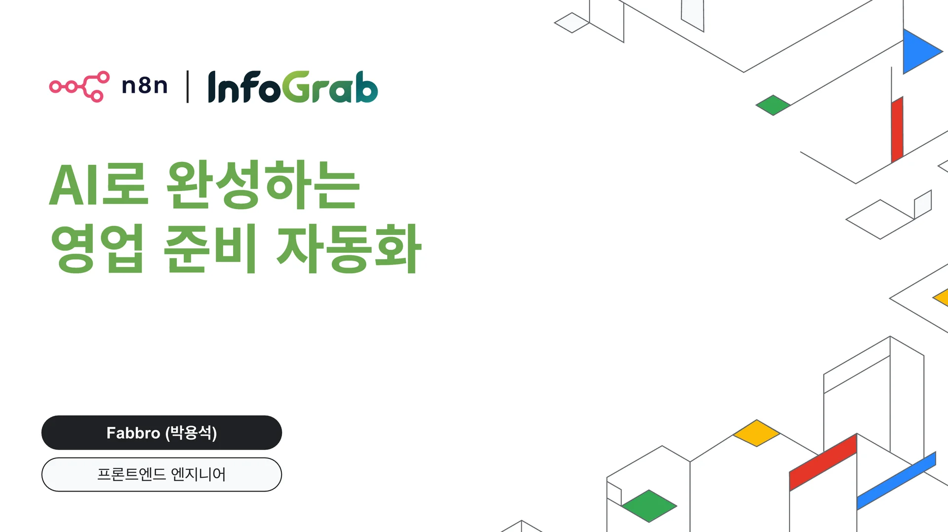 세 번째 세션에서는 인포그랩의 프론트엔드 엔지니어 Fabbro가 ‘AI로 완성하는 영업 준비 자동화’를 주제로 발표했습니다. 고객 문의 접수부터 회사 정보 수집, 요구사항 분석, 맞춤 상품 매칭, 미팅 준비까지 자동 완료하는 n8n 워크플로를 소개했는데요. 영업 준비의 비효율을 해결하고 신입 직원도 숙련자 수준으로 준비하는 데 도움이 되는 워크플로였습니다.