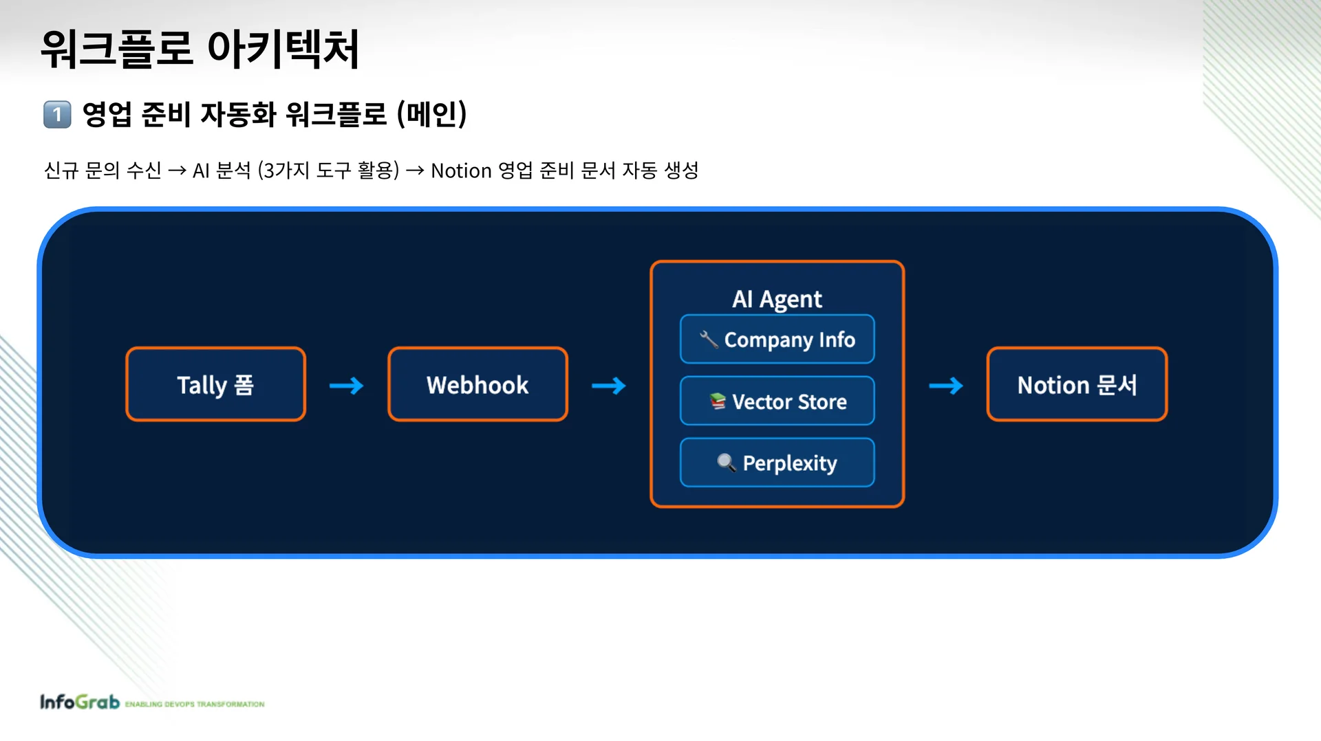 Fabbro는 이 문제를 해결하기 위해 두 가지 자동화 워크플로를 개발했습니다. 첫째는 영업 준비 자동화 워크플로인데요. Tally form으로 고객 문의를 수집하면, n8n의 AI Agent가 다음 세 가지 도구를 활용해 영업 준비를 진행하죠. 자사 정보를 담은 Company Info Tool, 과거 영업 이력을 저장한 Vector Store Tool, 고객사 정보 검색 도구인 Perplexity AI가 그 예입니다. 수집된 데이터는 최종적으로 Notion에 영업 준비 보고서로 저장돼요.