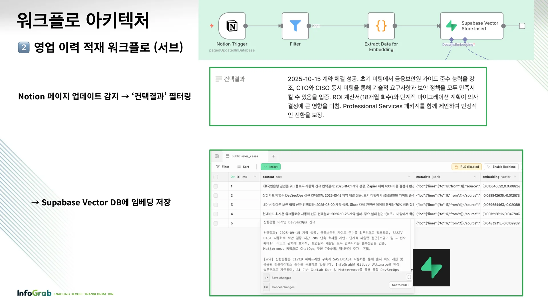 둘째는 영업 이력 적재 워크플로인데요. 이 워크플로는 Notion에 데이터가 업데이트되면 트리거되고요. Fabbro는 ‘컨택 결과’ 내용이 있으면 이를 벡터 DB에 저장하도록 콘텐츠, 메타데이터, 임베딩 항목을 각각 구성했습니다. 그는 “AI가 잘 이해할 수 있도록, 벡터 DB에서 잘 검색할 수 있게 데이터를 배치하는 게 중요하다”고 강조했습니다.
