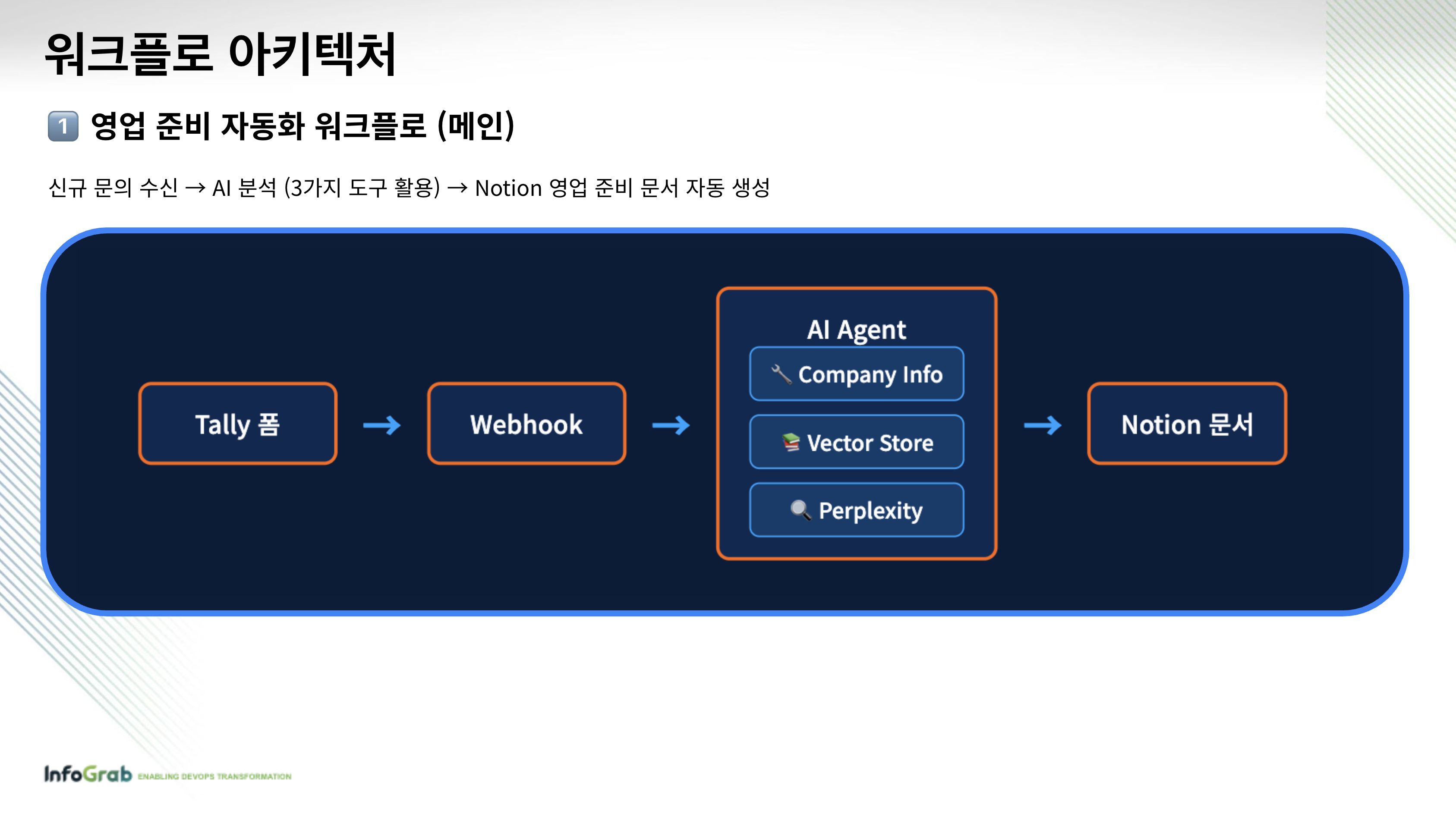 세 번째 세션에서는 인포그랩의 프론트엔드 엔지니어 Fabbro가 ‘AI로 완성하는 영업 준비 자동화’를 주제로 발표했습니다. 고객 문의 접수부터 회사 정보 수집, 요구사항 분석, 맞춤 상품 매칭, 미팅 준비까지 자동 완료하는 n8n 워크플로를 소개했는데요. 영업 준비의 비효율을 해결하고 신입 직원도 숙련자 수준으로 준비하는 데 도움이 되는 워크플로였습니다.