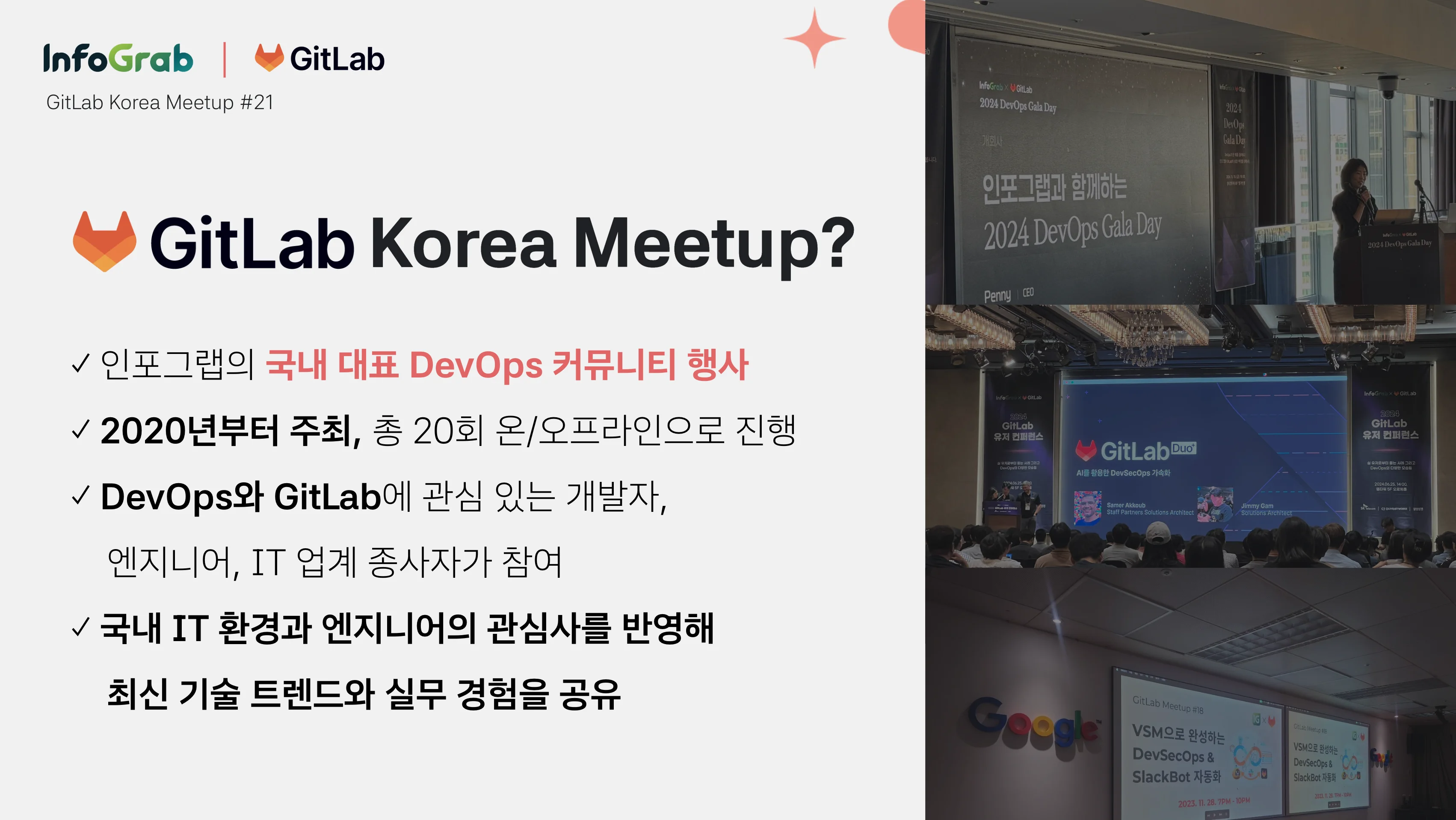 GitLab Korea 밋업은 2020년부터 인포그랩이 주최하고 있는 국내 대표 DevOps 커뮤니티 행사인데요. 현재까지 총 21회 온·오프라인으로 진행했고요. 최신 기술 트렌드와 실무 경험을 공유하며, DevOps와 AI, GitLab에 관심 있는 개발자와 엔지니어들이 활발히 참여하고 있습니다.