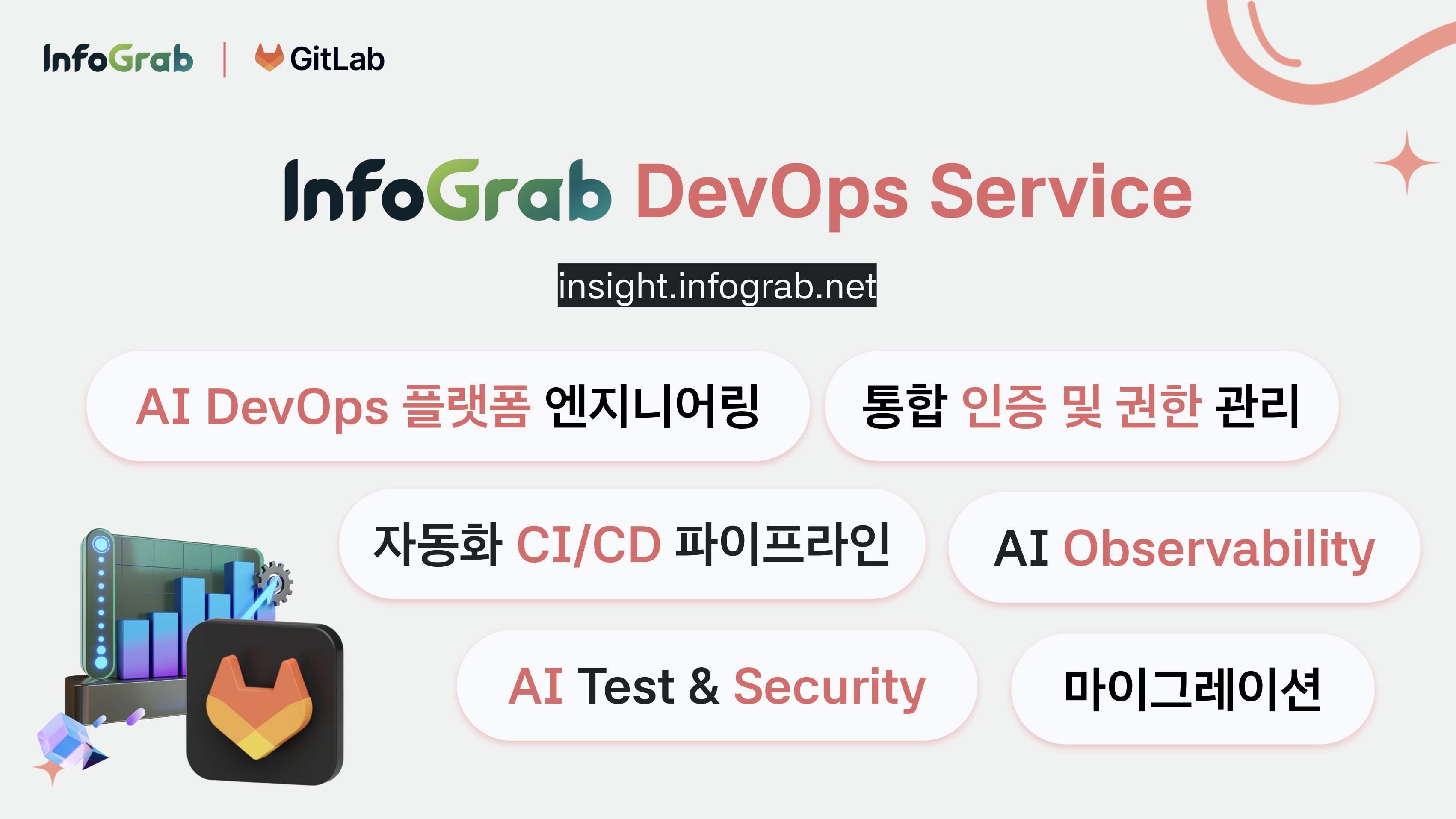 현재 인포그랩은 GitLab과 관련해 포괄적인 DevOps 서비스를 제공합니다. 플랫폼 구축, 기술 지원, 컨설팅, 라이선스 제공, 교육이 그 내용이죠. CI/CD 구축부터 인증·권한 관리, 보안, Observability까지 DevOps에 필요한 모든 것을 지원합니다.