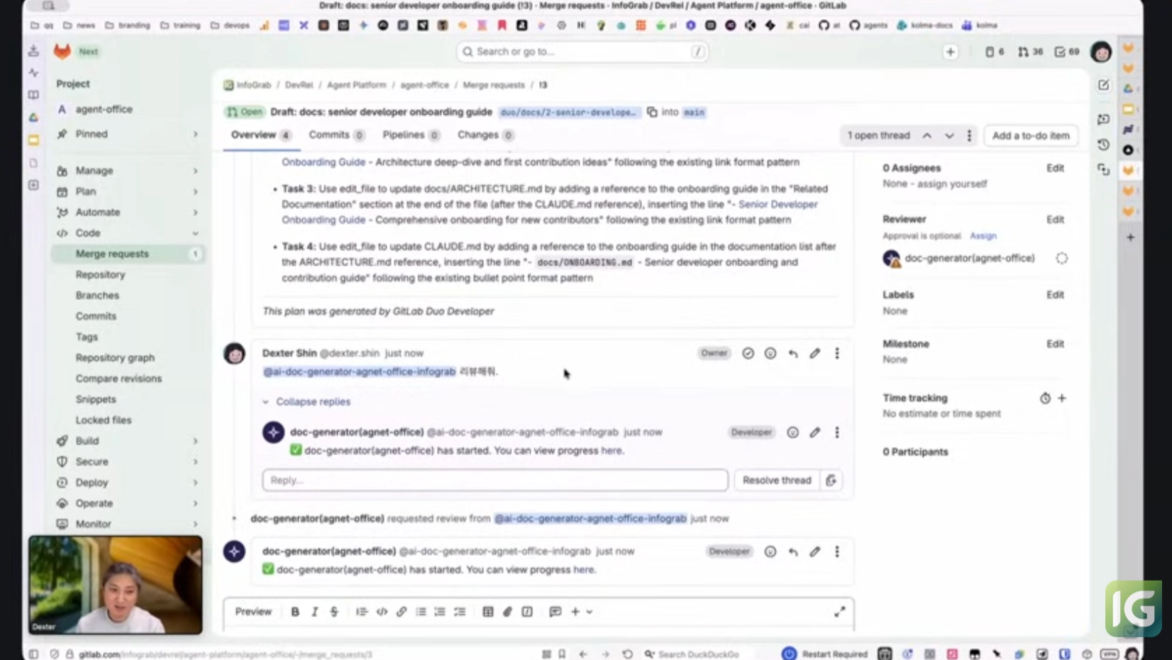 이어서 "시니어가 첫 번째로 기여할 수 있는 아이디어를 제안해 이슈에 추가해줘"라고 요청하자 이슈가 자동 생성됐죠. 이슈에서 "Generate MR with Duo" 버튼을 클릭하면, 새로운 세션이 열려 Developer/v1 Flow가 작업을 실행하고요. 이슈를 구현하고 MR까지 자동 생성했습니다. 커스텀 에이전트를 MR에 멘션하면 리뷰도 자동으로 수행하고요.