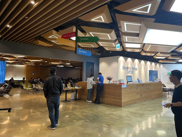 현장에 도착하니 리셉션과 넓은 로비가 저희를 반겨주세요! 저 멀리 접수대와 간식도 살짝 보입니다.