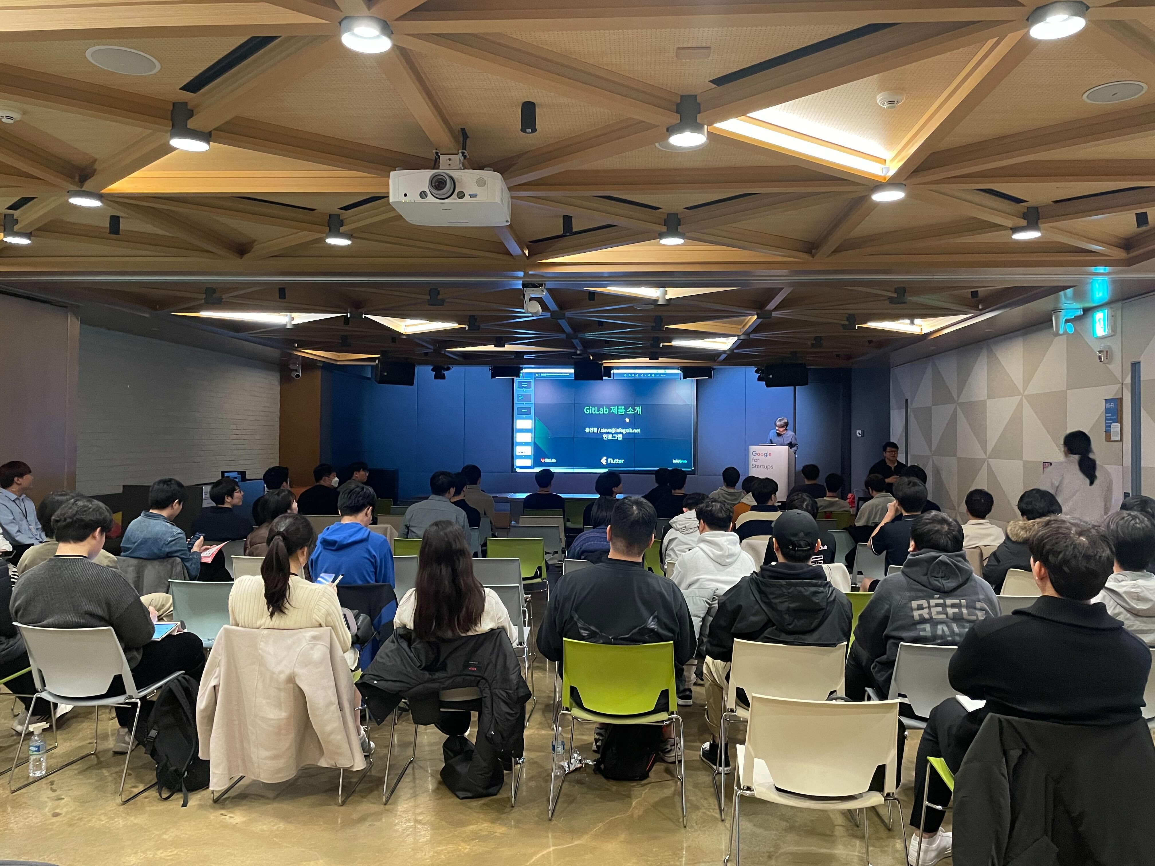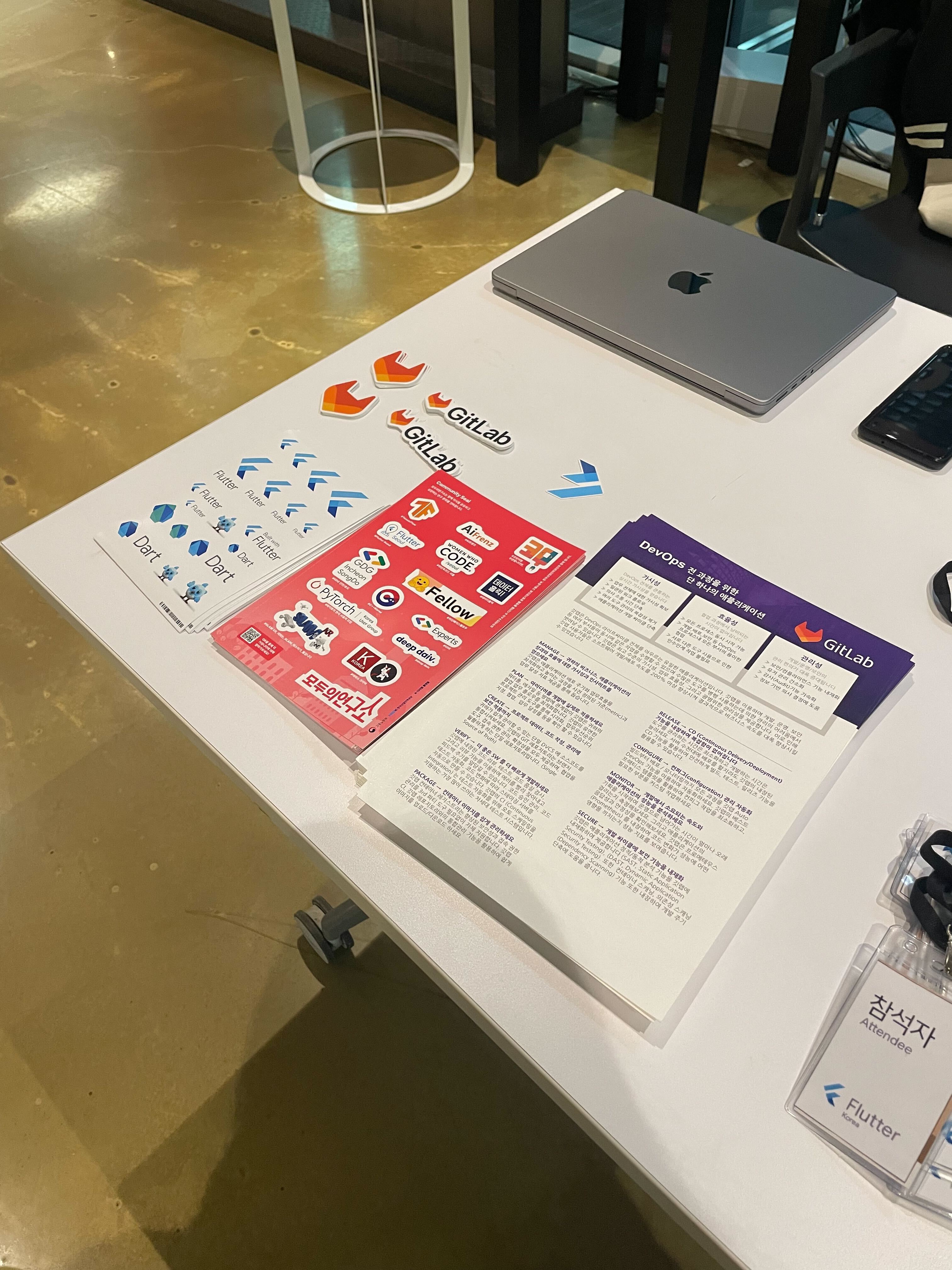 로비를 지나 현장 접수대에 들어서자마자 보이는 GitLab 굳즈를 비롯해 Flutter 굳즈가 눈에 띄었는데요! 다양한 스티커가 참 귀엽죠? 이와 더불어 참석자 배지와 설문지를 비롯해 음료와 과자 같은 허기를 달래줄 맛있는 아이템들도 함께 준비 되어 있었습니다. 세션 시작 전 참석하신 분들 모두 저녁 식사 후 간단하게 먹을 수 있는 과자와 음료를 챙겨 자리에 앉았습니다.