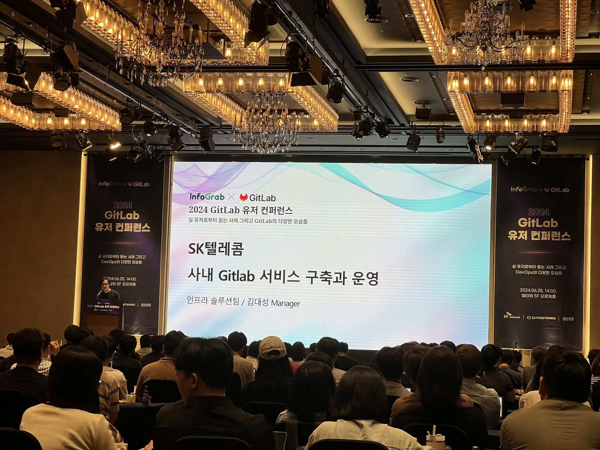 어느덧 시간이 지나고 150분 가까이 되는 분들께서 그 많은 자리를 빛내주셨어요. 인포그랩 DevOps 팀 Dexter와 GitLab Korea의 오프닝 인사로 GitLab 유저 컨퍼런스의 시작을 열었습니다.