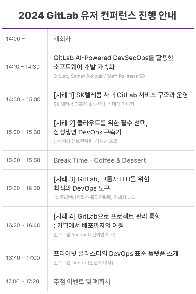 - 행사 시간 내 현장에서 촬영된 사진은 추후 인포그랩, GitLab 공식 채널 및 홈페이지, 매체, SNS 등 홍보 자료로 활용될 수 있으며, 컨퍼런스장 입장 시 촬영 및 활용에 동의한 것으로 간주됩니다.