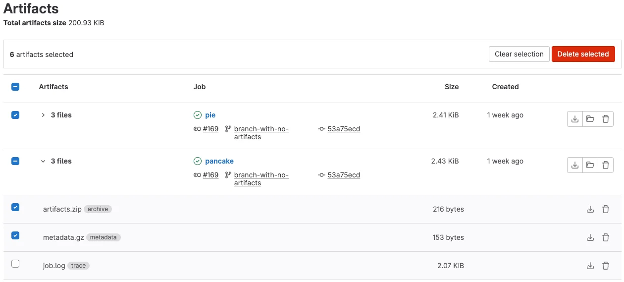최소 Maintainer 권한을 보유한 사용자는 이 새로운 인터페이스를 사용해 아티팩트를 삭제할 수도 있습니다. 개별 아티팩트를 지우거나, 수동 선택으로 또는 페이지 상단의 Select all 옵션을 체크해 한 번에 아티팩트 최대 100개를 대량 삭제할 수 있습니다.