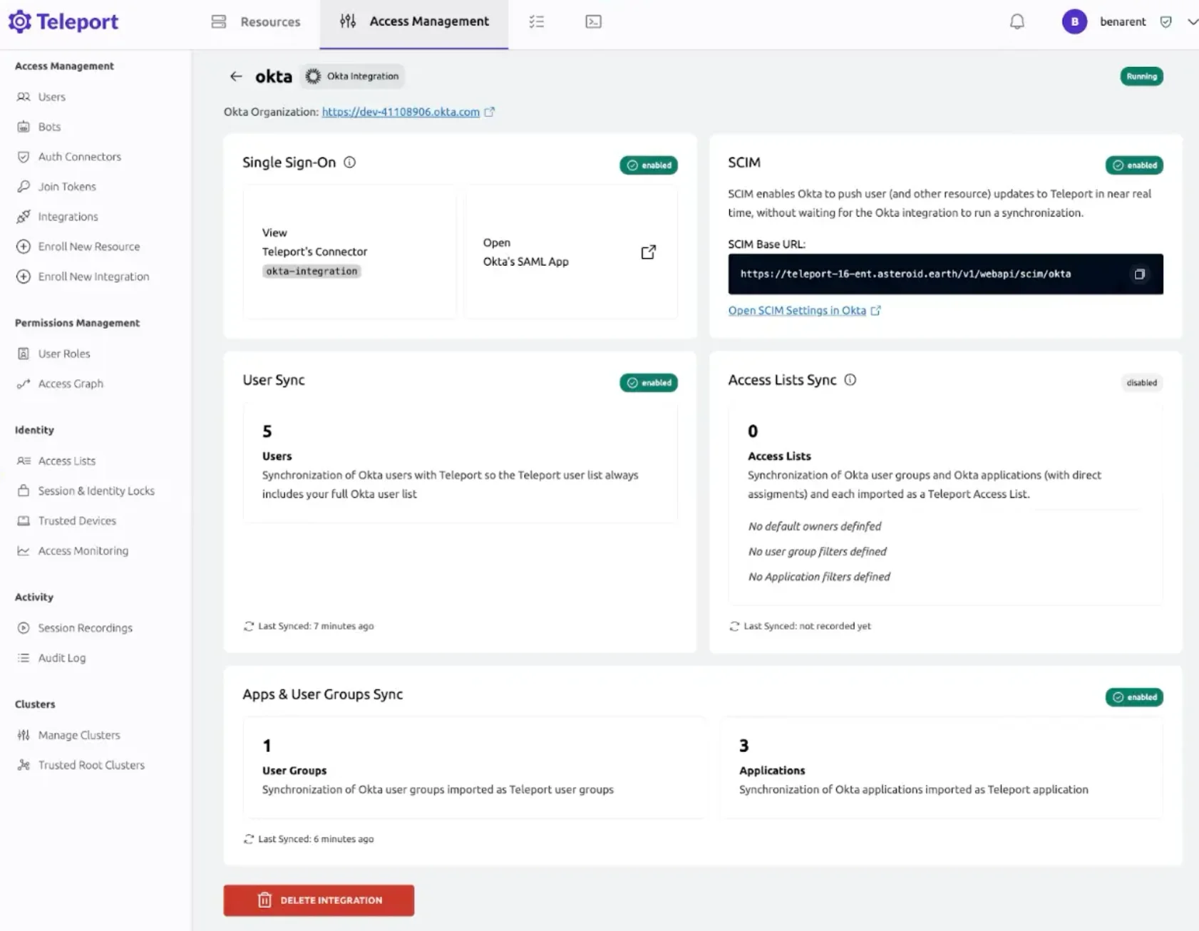 - Okta 통합이 동기화를 실행하기를 기다리지 않고 Okta가 실시간으로 사용자(및 기타 리소스) 업데이트를 Teleport에 푸시할 수 있도록 하는 SCIM